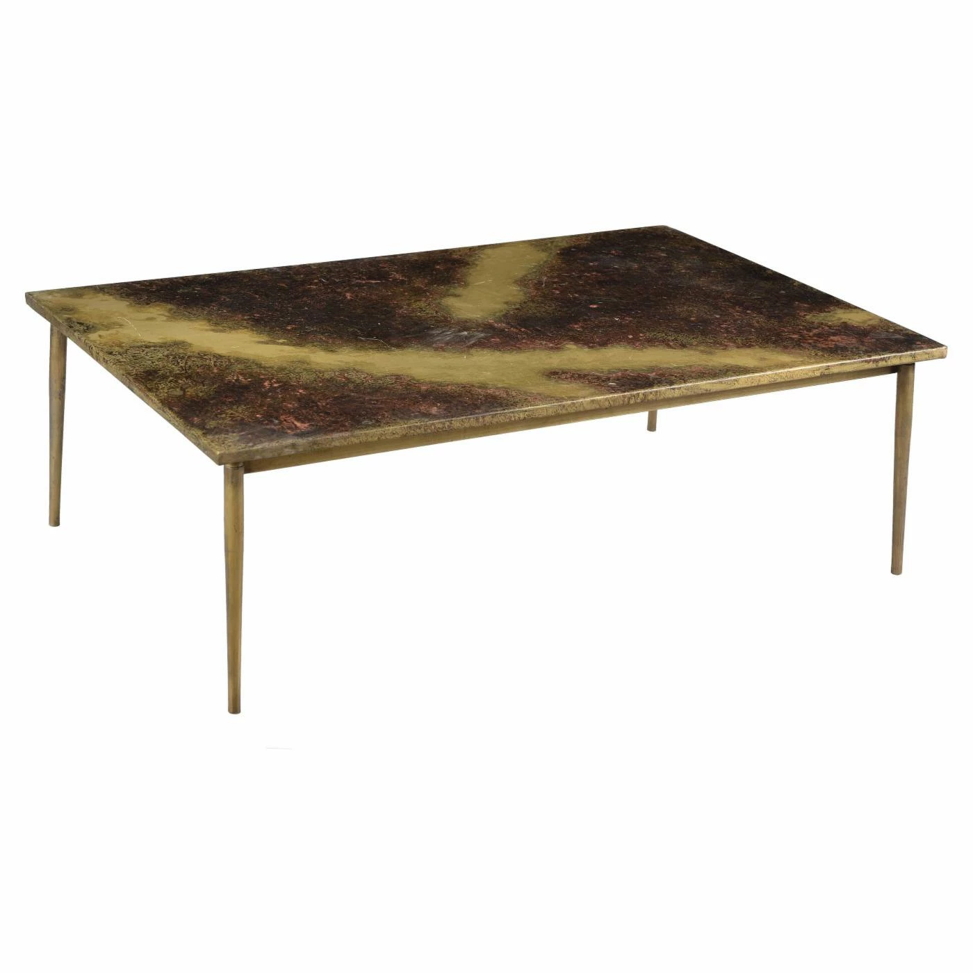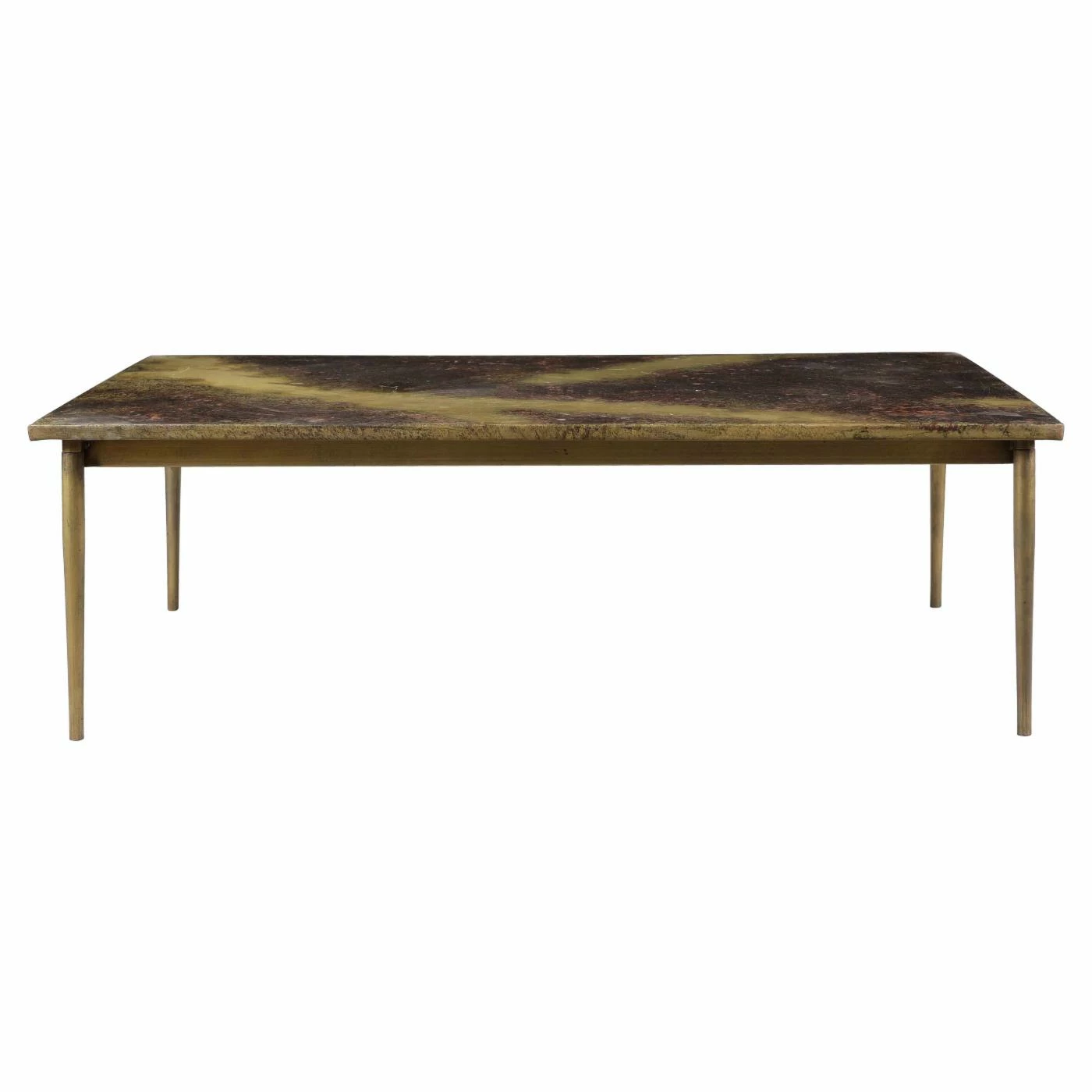 - Tapered legs in antique brass