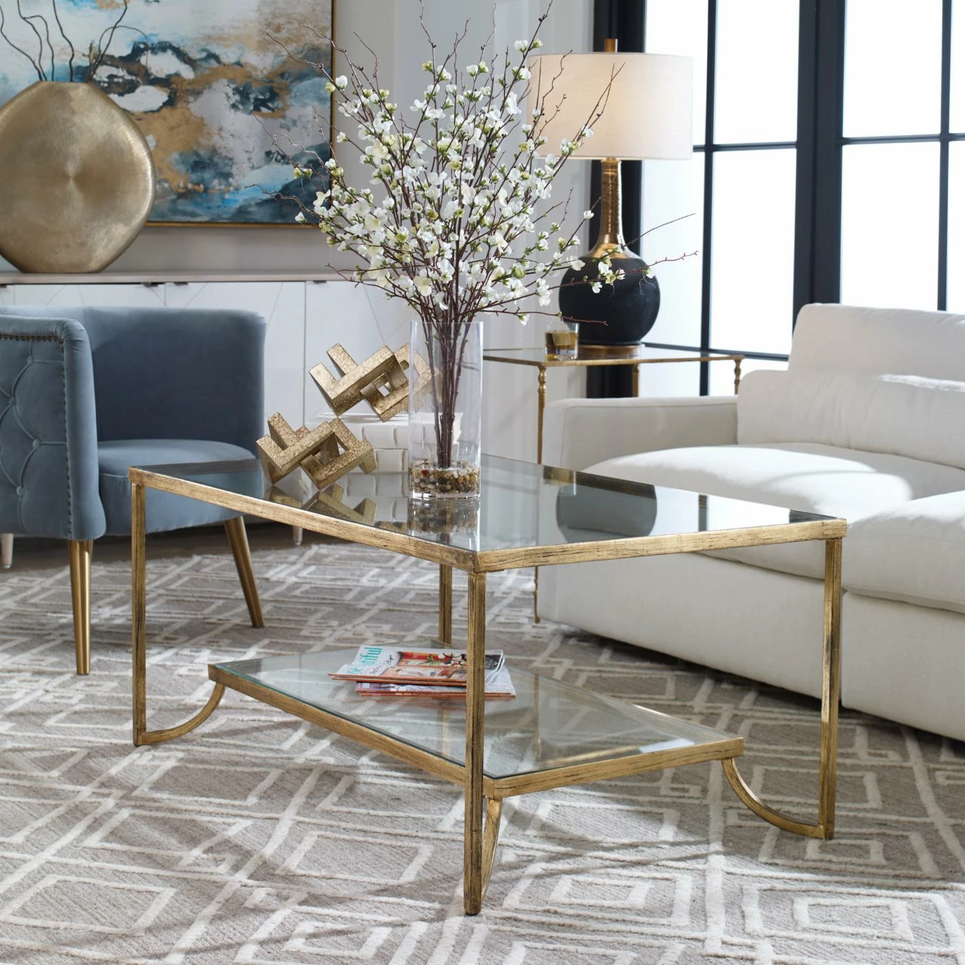 Curved legs support the clear tempered glass gallery shelf and make this Uttermost Katina Coffee Table distinctive. Its forged iron frame features a glamorous antiqued gold leaf finish that works with classic or contemporary rooms. The spacious clear tempered glass top makes this coffee table perfect for your space.