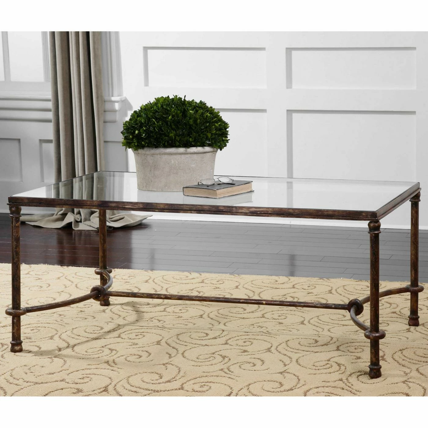 The Uttermost Warring Iron Coffee Table features a transitional design inspired by ancient horse bridles. It flaunts a clear, tempered glass top and forged iron frame with subtle rings and curves finished in rustic bronze patina.