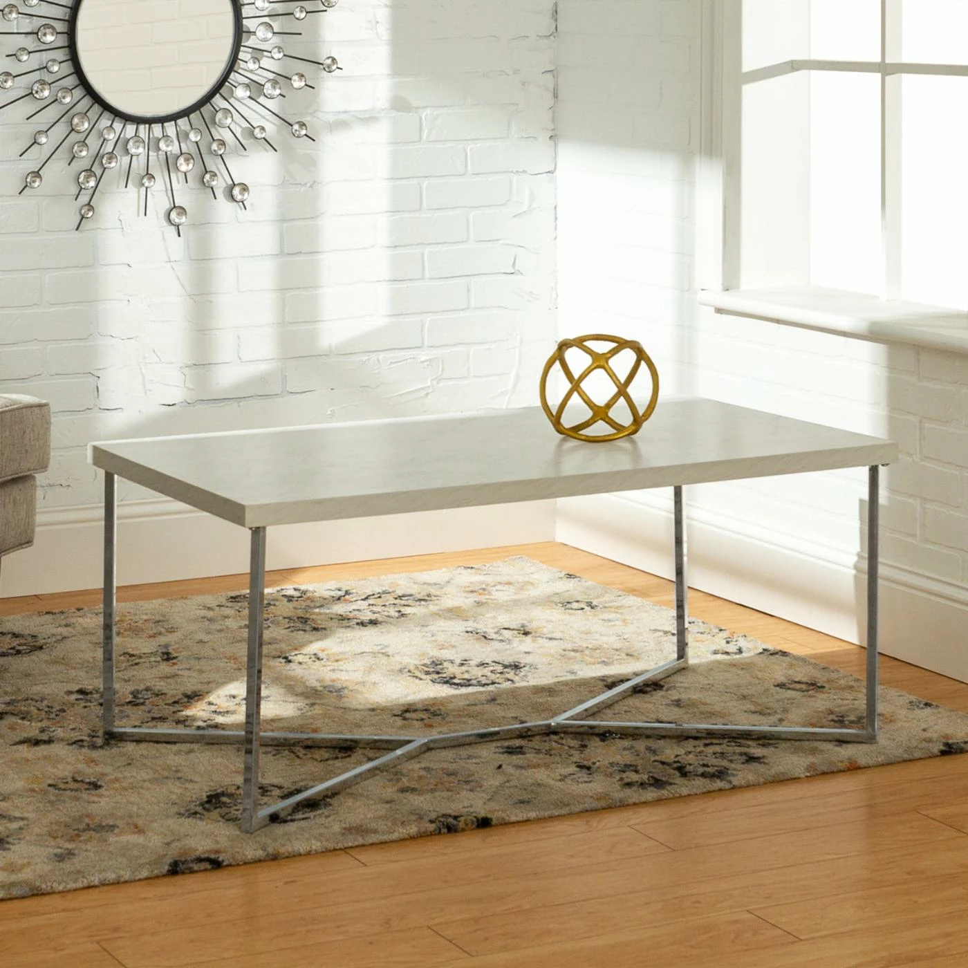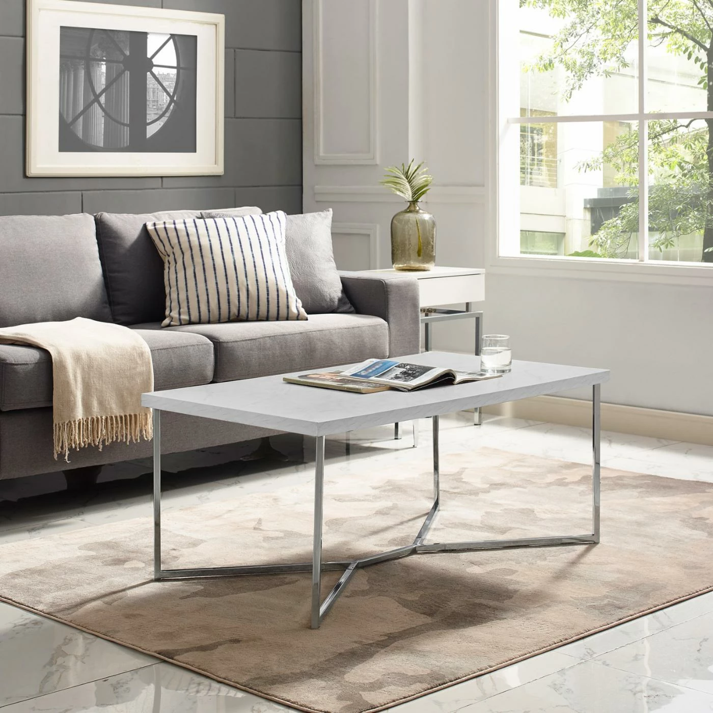 Complete your living area with the Walker Edison Y-Leg Coffee Table, which will provide a contemporary focal point for your arrangement. This coffee table features a sleek Y-leg base that’s made of powder-coated metal for durability. It’s topped with a rectangular faux marble surface in crisp white. Choose from available frame finishes to best coordinate with existing furniture and dรฉcor.