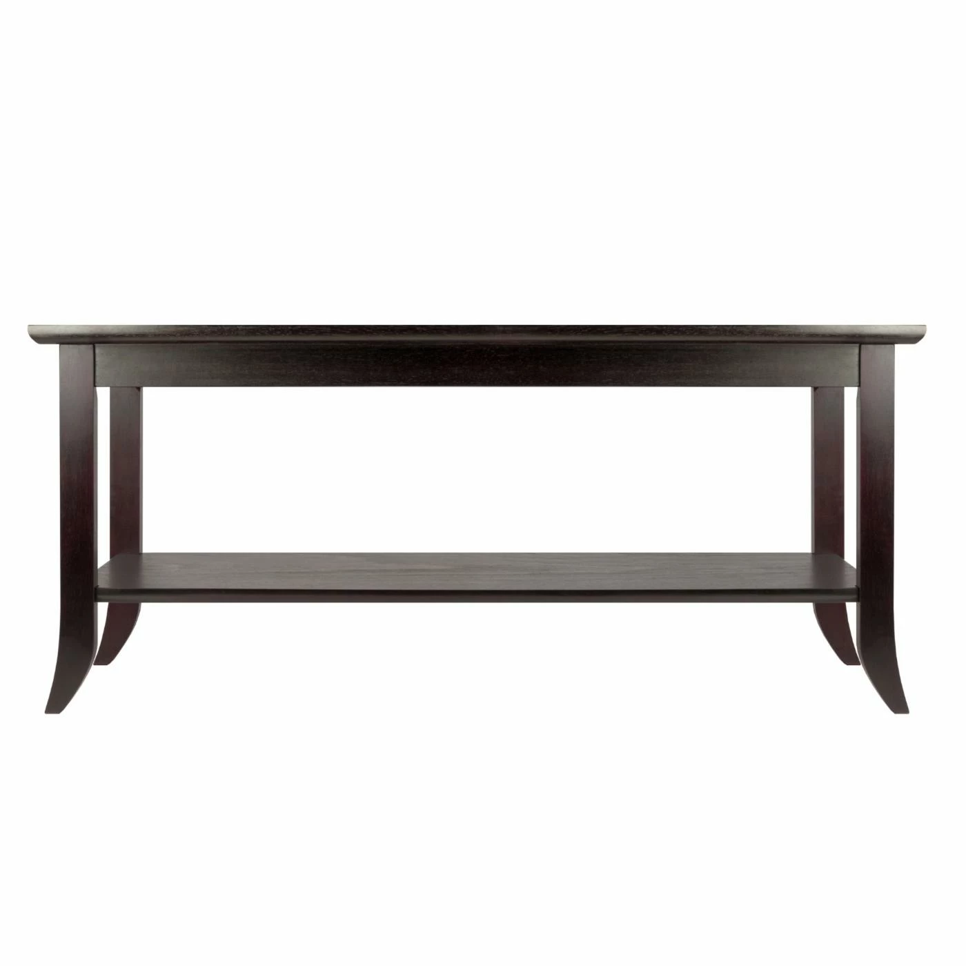 With its fixed shelf, flared legs, and clear glass top, the Winsome Genoa Rectangular Coffee Table with Glass Top is a simple yet compelling study in visual contrast. This classic transitional wood coffee table comes in a dark espresso finish and a tempered glass top for reliable style and durable performance.