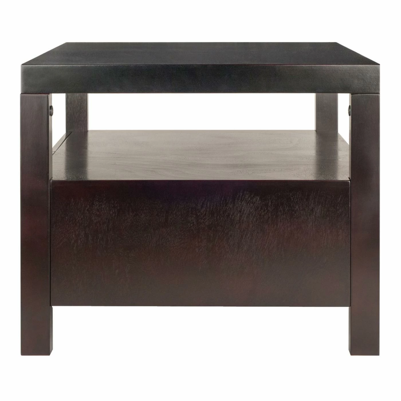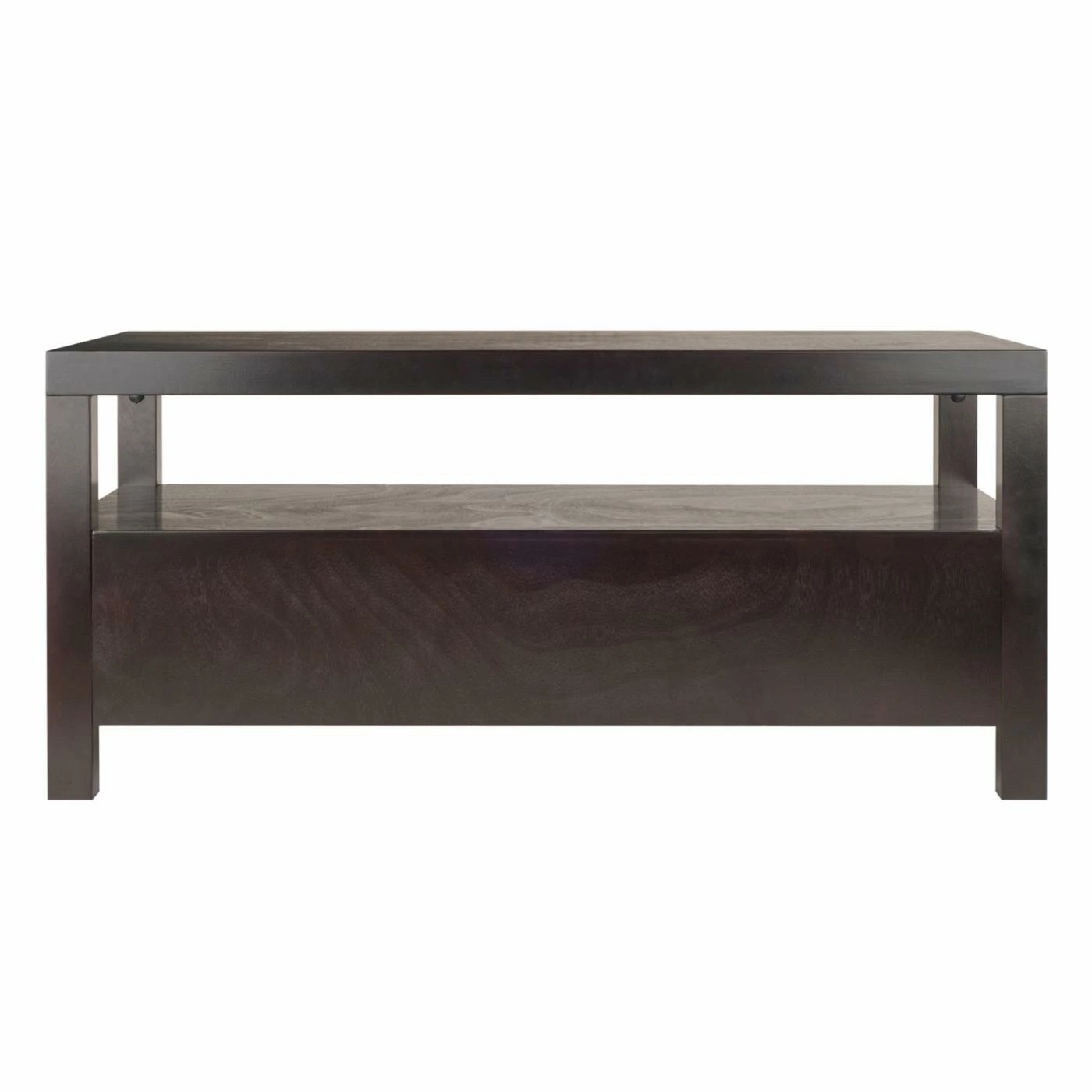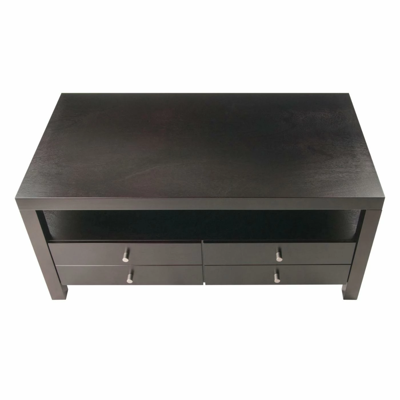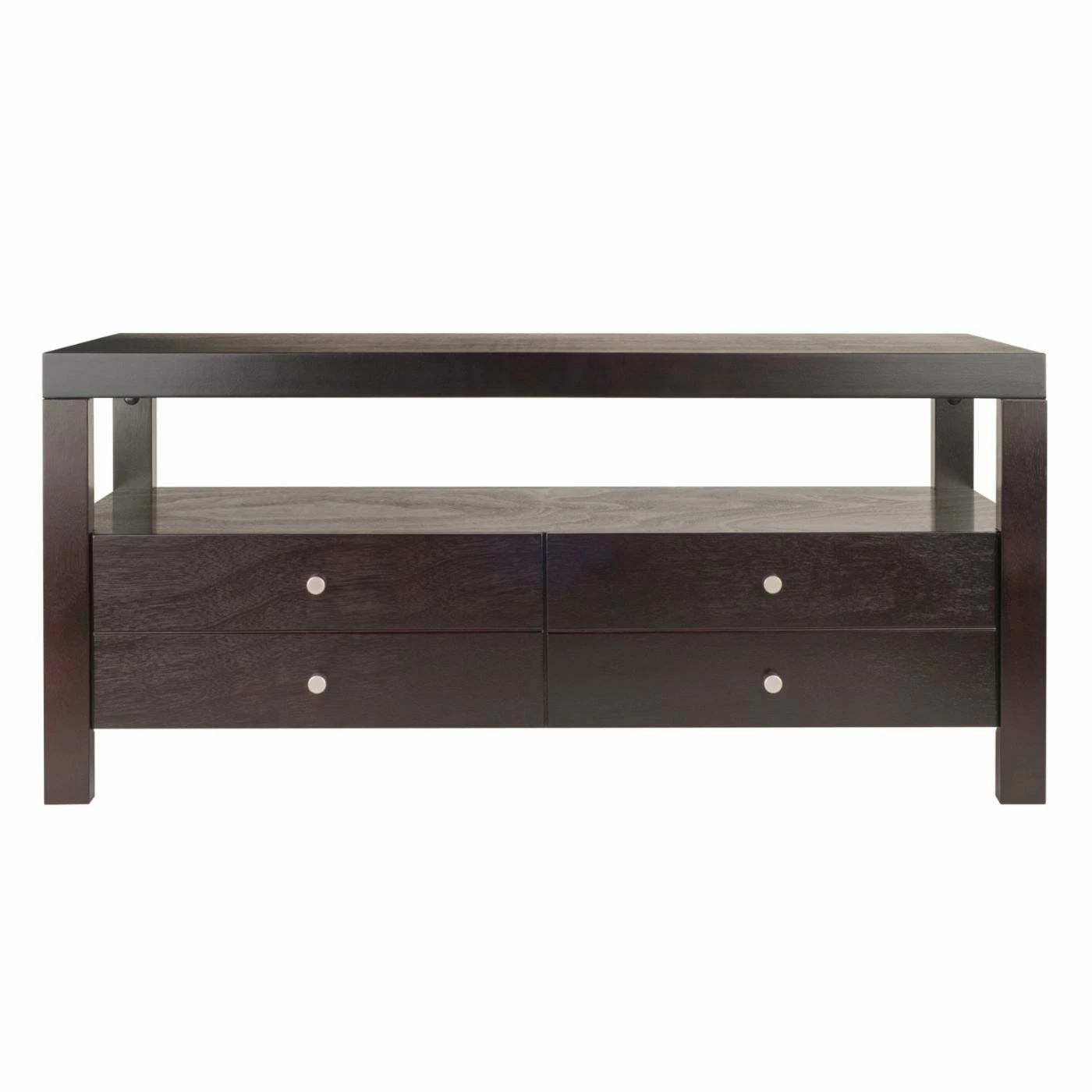The Winsome Trading Copenhagen Coffee Table showcases a low-profile shape, and is constructed of solid wood and composite wood components. This coffee table has two large drawers that are just the right size for stashing books, remotes, or a couple of cozy throws. A large open shelf just beneath the tabletop give you space for storage, or to display decor.