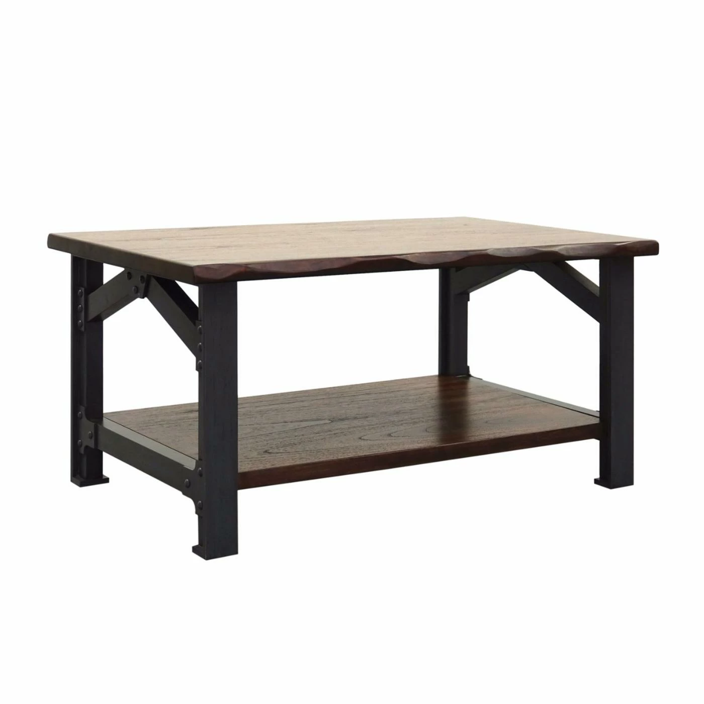 For a rugged, industrial vibe the Yosemite Home Decor Bethel Park Coffee Table features a robust wood frame with metal accent rivets and a graphite gray powder-coated finish. This coffee table offers a solid wood top and lower shelf, both with a faux live edge that enhances its appeal. Look for other pieces in the Bethel collection for a cohesive look in your living space.