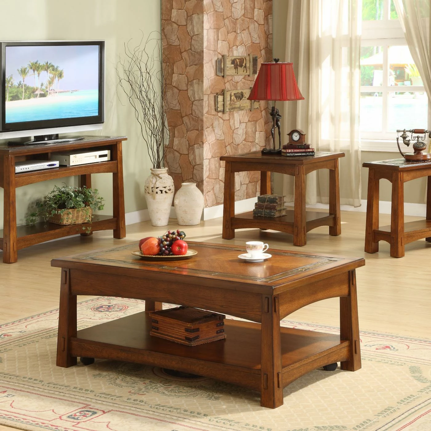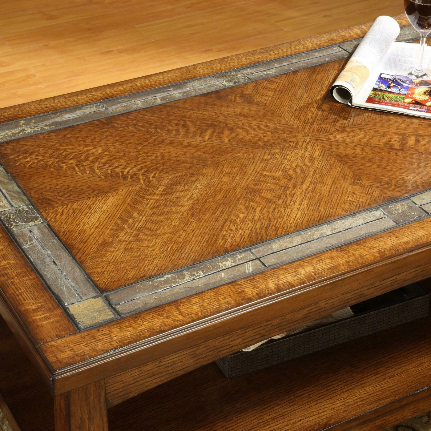 Perfect for just about any living room dΓ©cor, the Riverside Craftsman Home Rectangle Cocktail Table lends a casual elegance to your room. Built to last from hardwood solids and oak veneers, this table has a beautiful Americana Oak finish that lends it the appearance of age. A slate tile border and reverse diamond veneer panel insert add a unique accent to the table’s top. The fixed bottom shelf adds extra storage for your favorite reading material, or a place to add a dΓ©cor item or two.