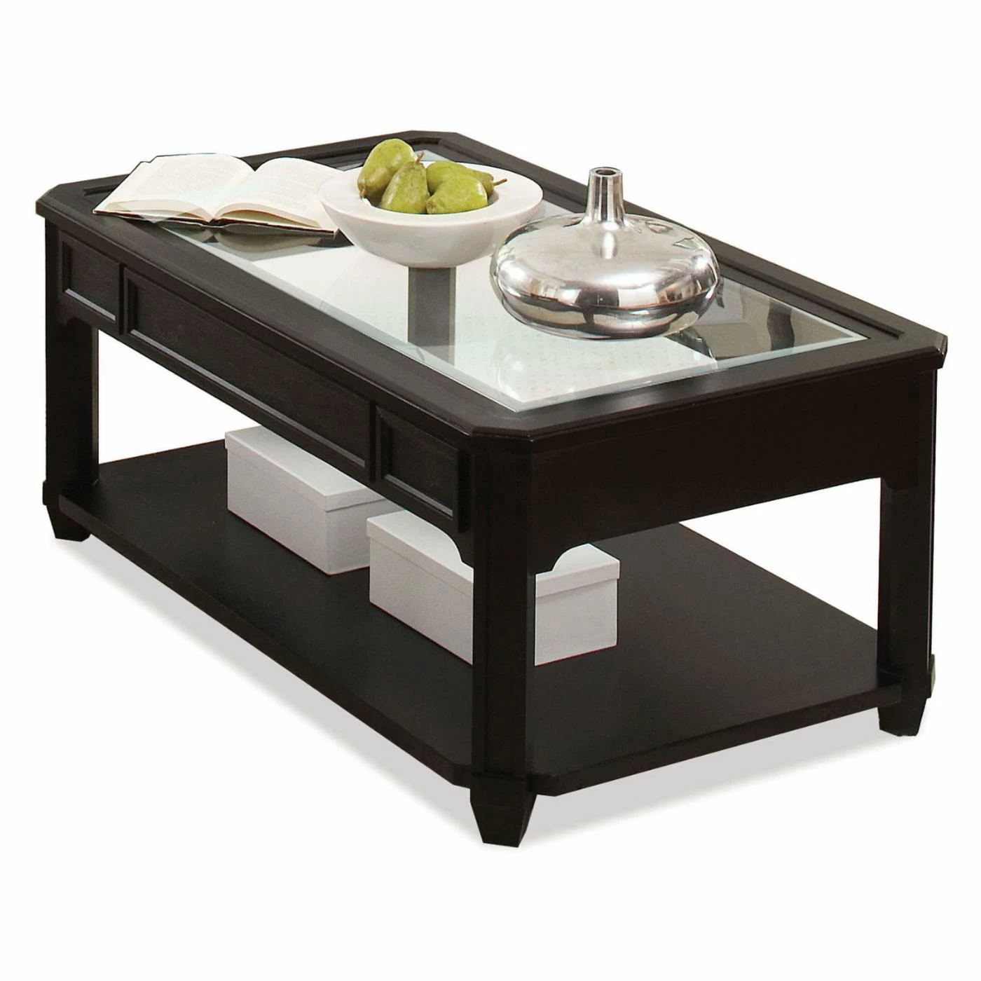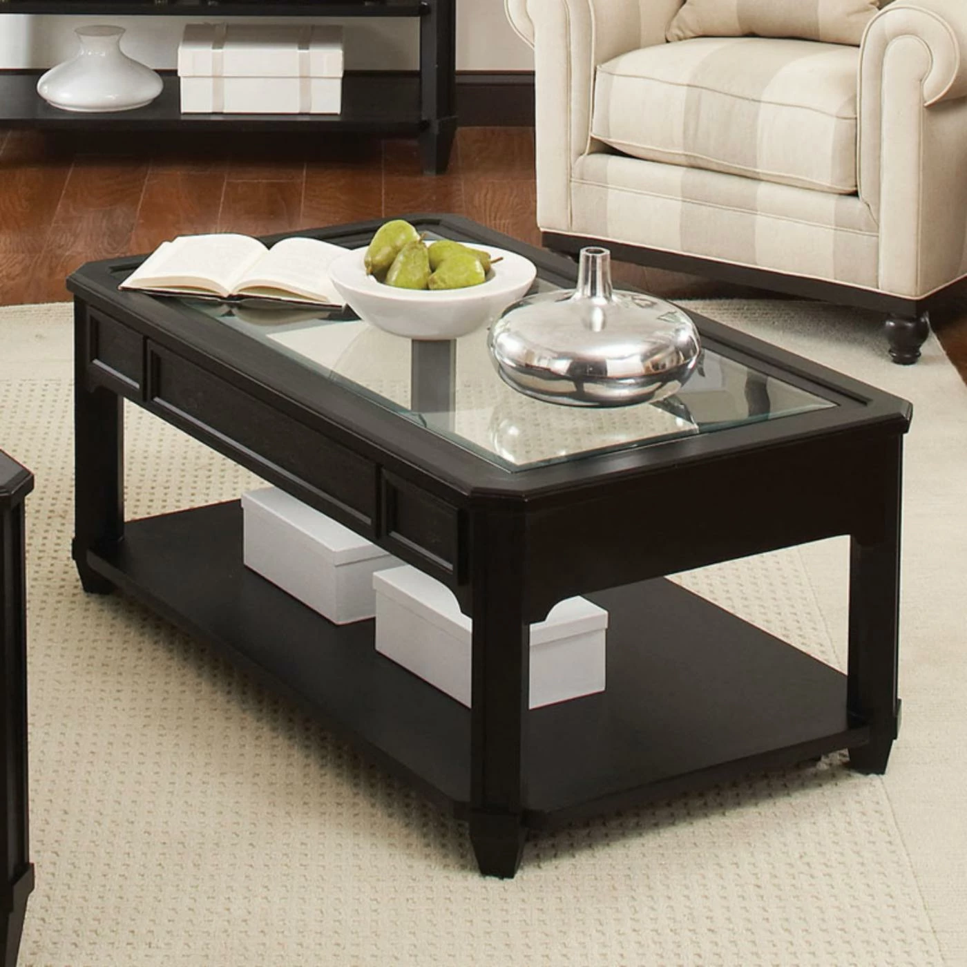 The chic look of the Riverside Farrington Rectangular Glass Top Cocktail Table – Black Forrest Birch is the perfect finishing touch to your stylish home. The hardwood construction ensures lasting beauty while the dramatic black forest birch finish adds a striking detail. The glass top is just right to lighten the look, and the open shelf below provides convenient storage. Assembly required.