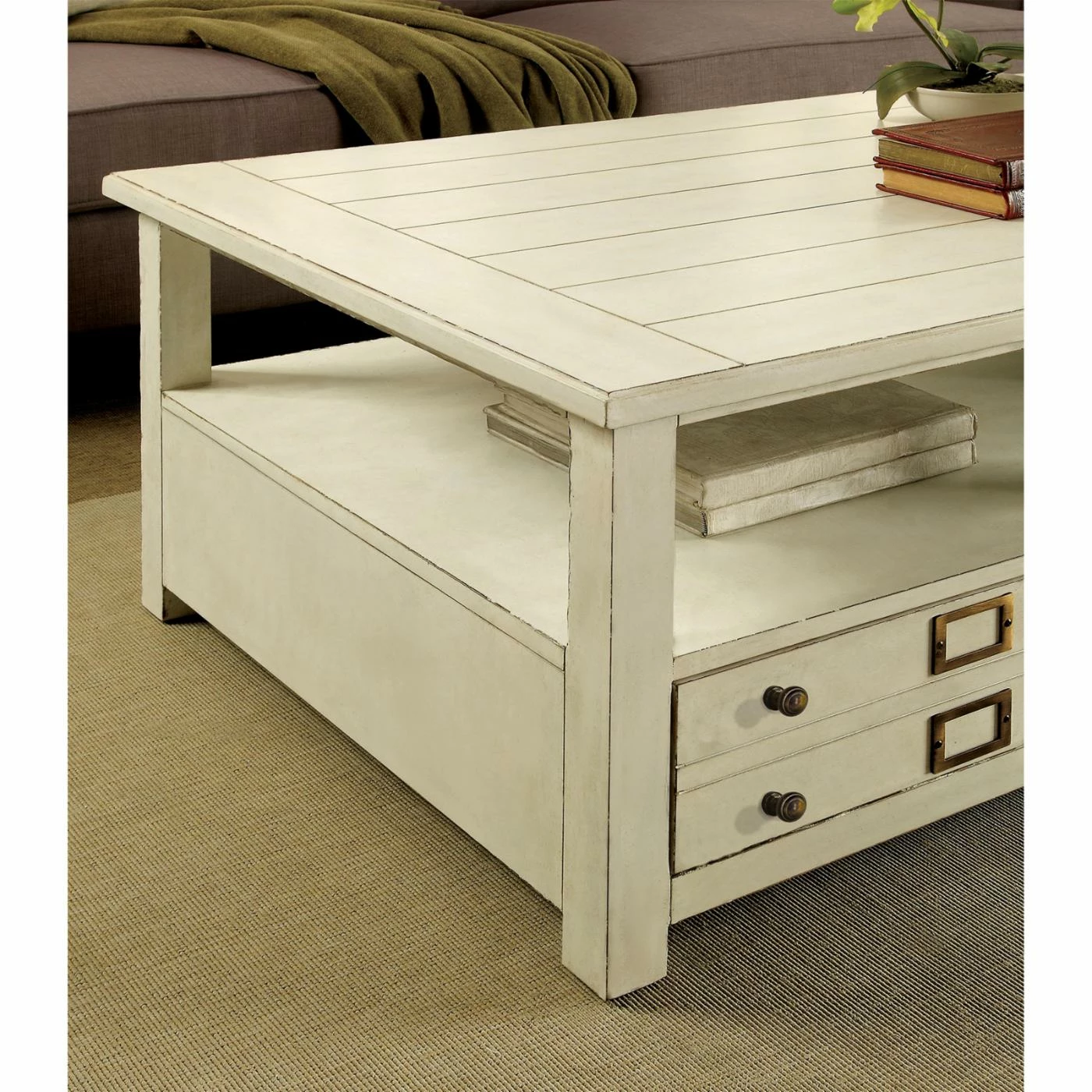 With clean lines, an imaginative design, and a cheerful glow, the Riverside Sullivan Cocktail Table is both ravishing and sweet. When you step into your living room to see this country white, hand-chiseled wonder, you’ll be overcome by feelings of warmth and serenity. Crafted of solid poplar with a fetching birch veneer, this charming table is fashioned to impress and built to withstand the unexpected. Featuring a fixed center shelf for dΓ©cor and two fabulous drawers, the table is just as practical as it is pleasing to the eye.