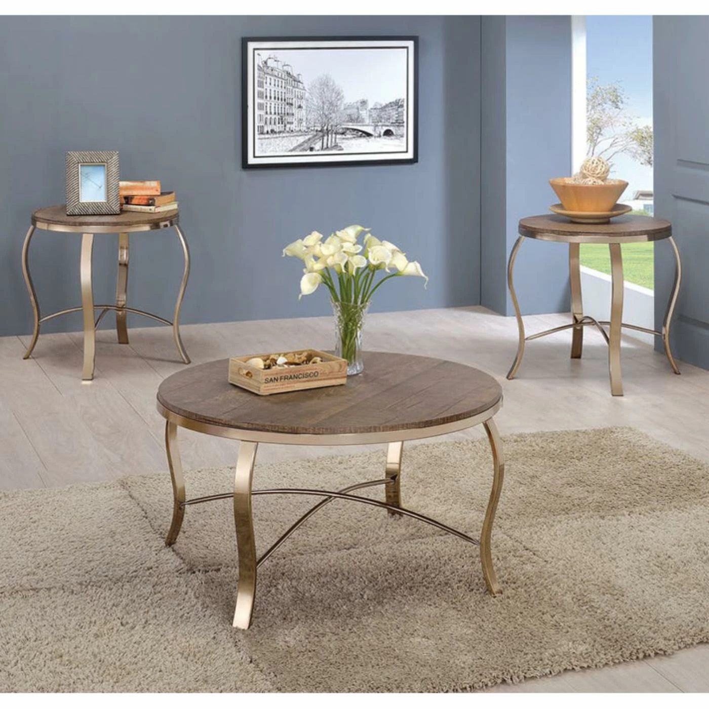 The Benzara Wicklow 3 Piece Round Occasional Table Set is a mixed-material stunner with a rustic two-tone finish. This set includes a coffee table and two end tables, all of which feature curved metal legs. The tabletops are crafted of engineered wood and feature convincing woodgrain detail. Choose from available finish options.