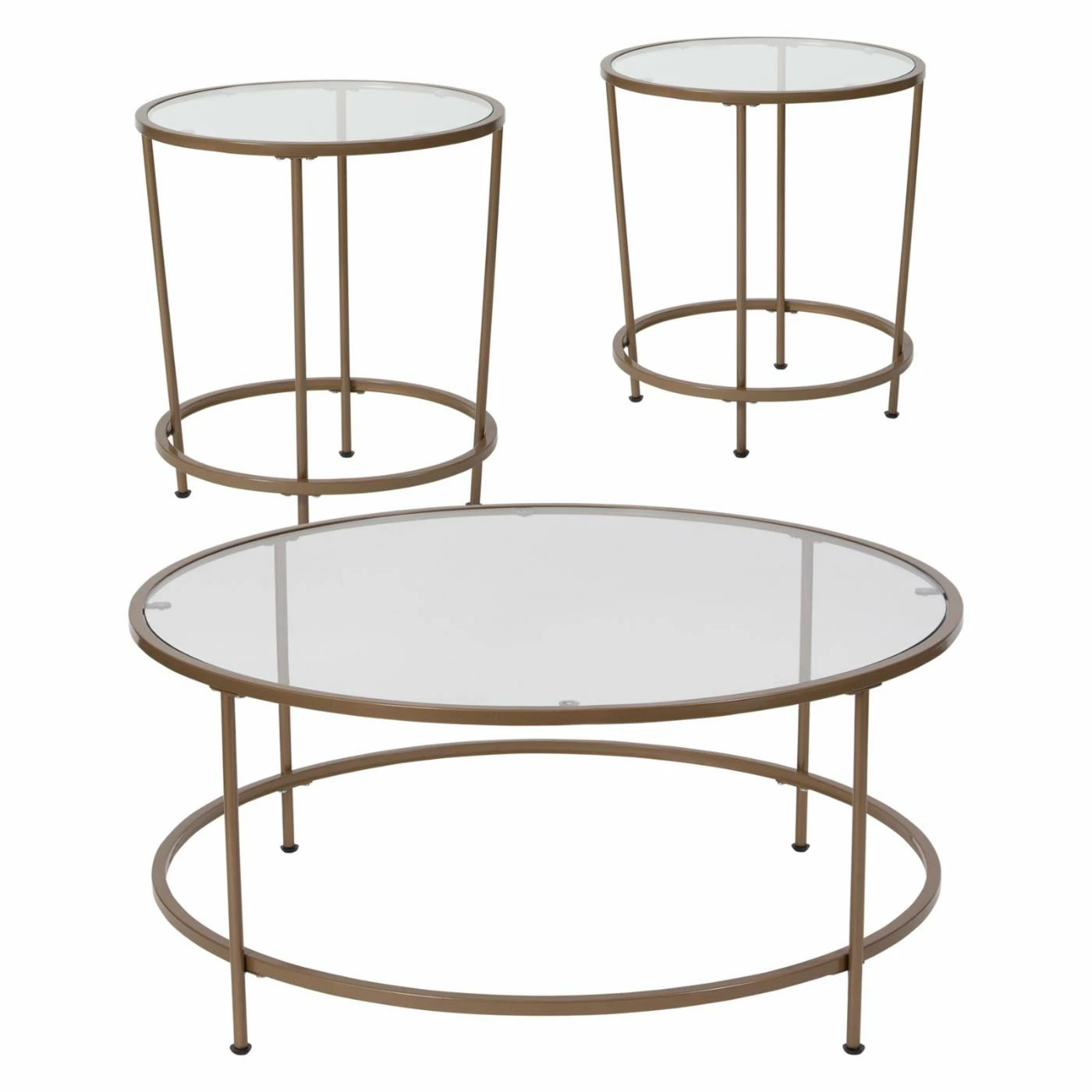 Glam up your living room by inviting the Flash Furniture Astoria 3 Piece Coffee Table Set into the dΓ©cor mix. Open rings and a gold finish ensure this coffee table set will be the jewel of your room. Each is topped by clear tempered glass for a spacious feel. This set is a great choice for smaller living spaces.