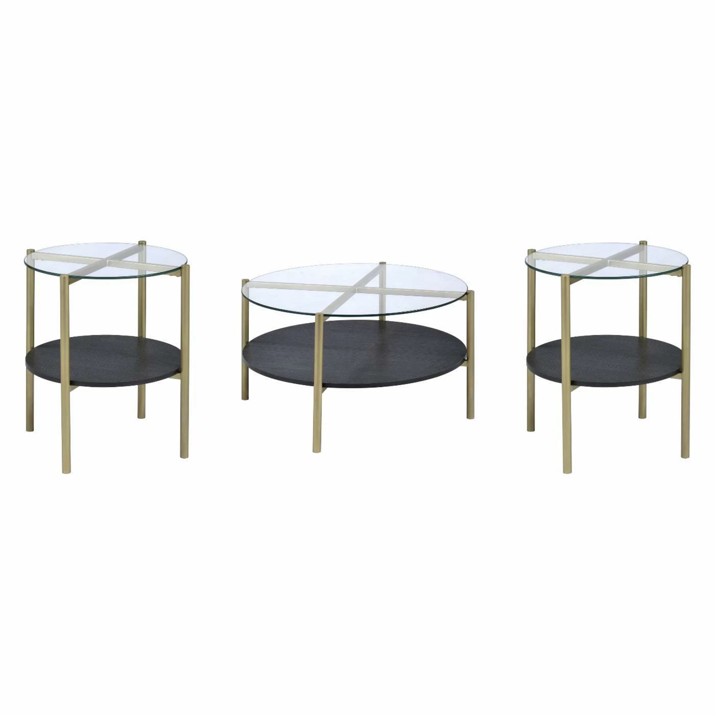 A mix of materials and smooth lines gives the Picket House Furnishings Blaine 3 Piece Occasional Table Set its contemporary feel. Designed to give you a cohesive living room design, this set includes a round coffee table and two matching end tables. All feature a round, tempered glass top, black wood grain-finished shelf, and slim gold framework.