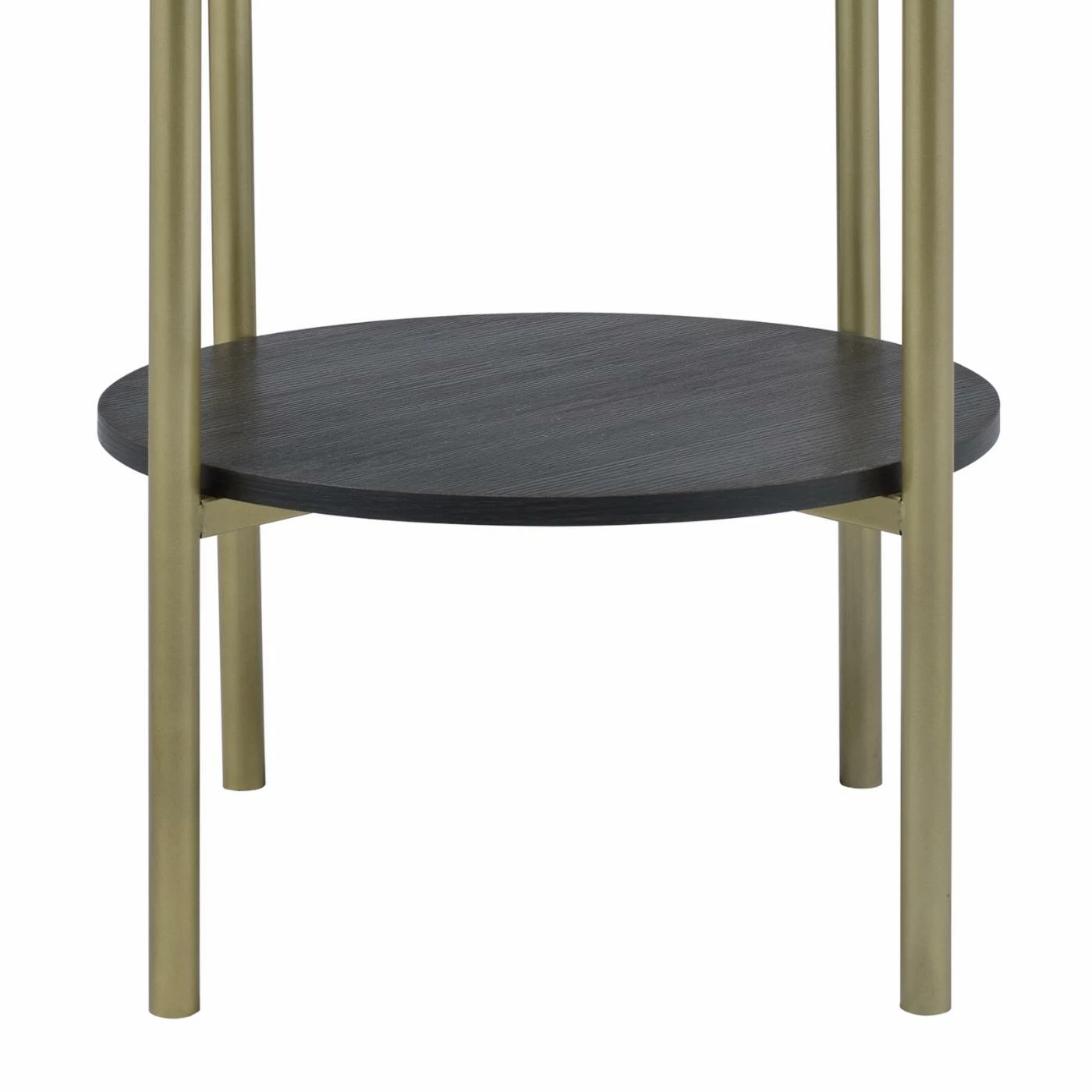 - Gold metal and black wood grain finish
