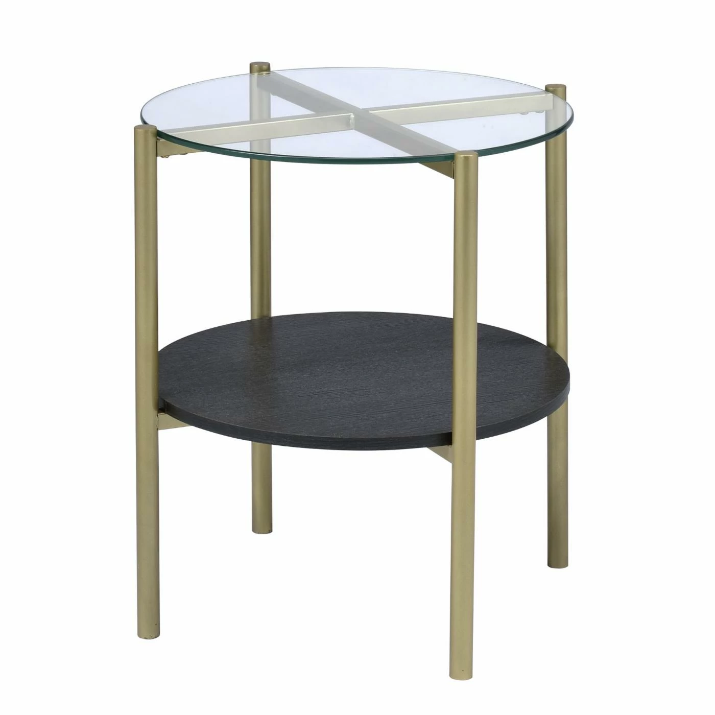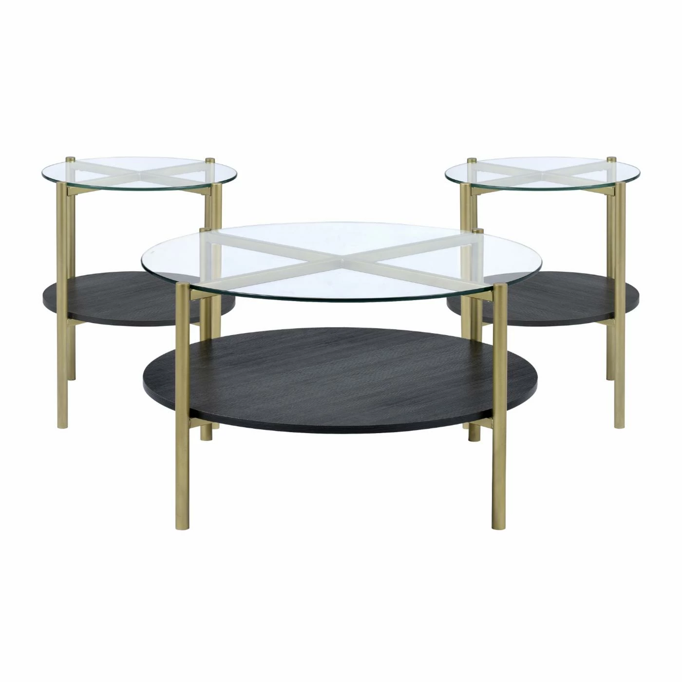 The Picket House Furnishings Dyson 3 Piece Cocktail Table Set is all about swank and functionality. Includes one coffee table and two end tables. The round tops are made of sleek glass and situated atop a X-shaped metal frame that boasts a gold tone. The lower shelf is fashioned with dark toned wood. This set really embodies the beauty of using mixed materials creating a look that is versatile and modern. Showcase your favorite home dรฉcor pieces or keep your living room essentials in reach on the lower shelf.