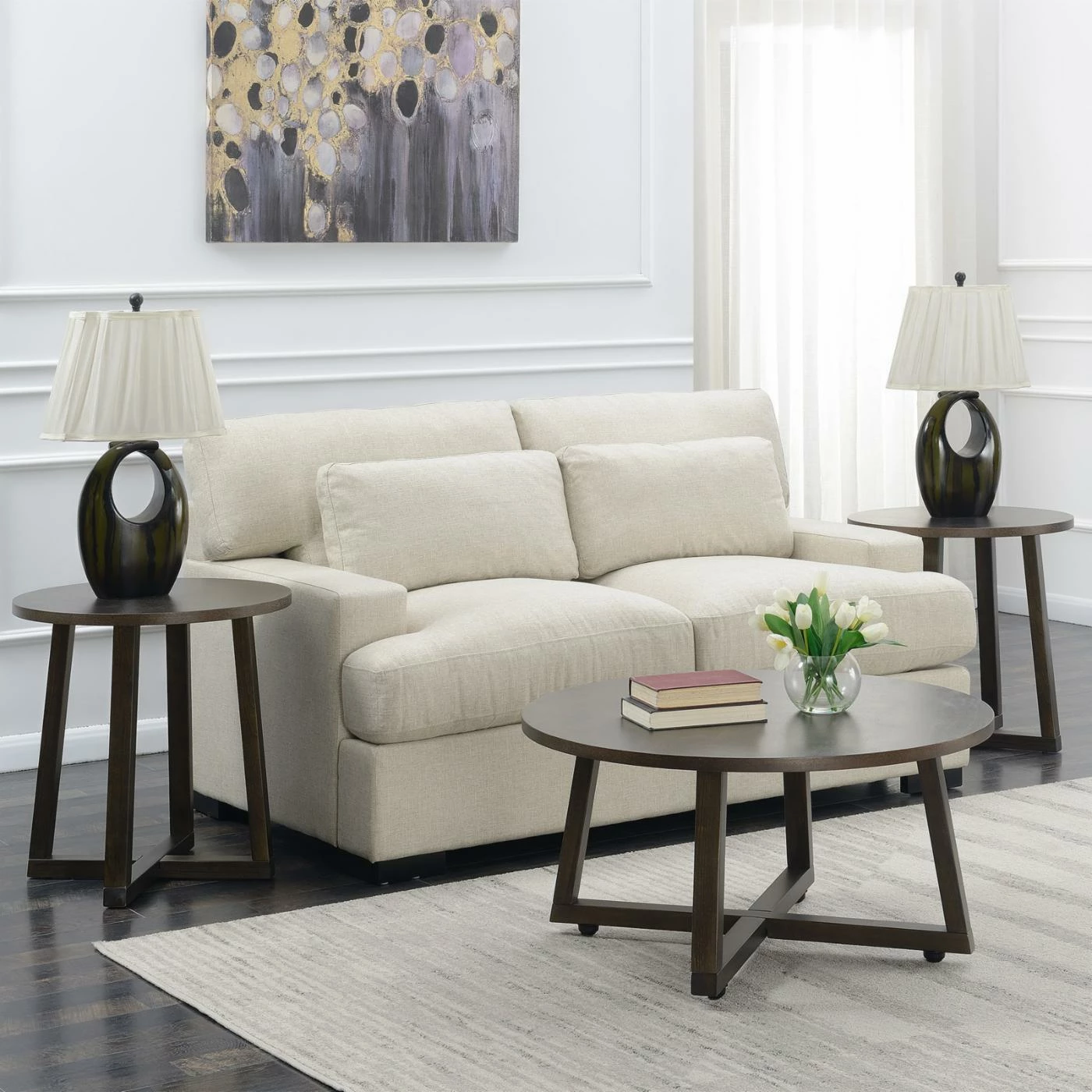 The Picket House Furnishings Jacob 3 Piece Coffee Table Set is an easy way to add a bit of MCM style to a wide variety of modern spaces. This set includes a coffee table with two matching end tables. Each piece is made from a mix of solid hardwood and engineered woods. The smoky walnut finish gives it a classic color that complements the minimal design. Wide, oval tops set on open, sleigh-style legs. This set has a clearly mid-century pedigree, but it’s also versatile enough to fit right along with a wide range of contemporary home decor schemes.