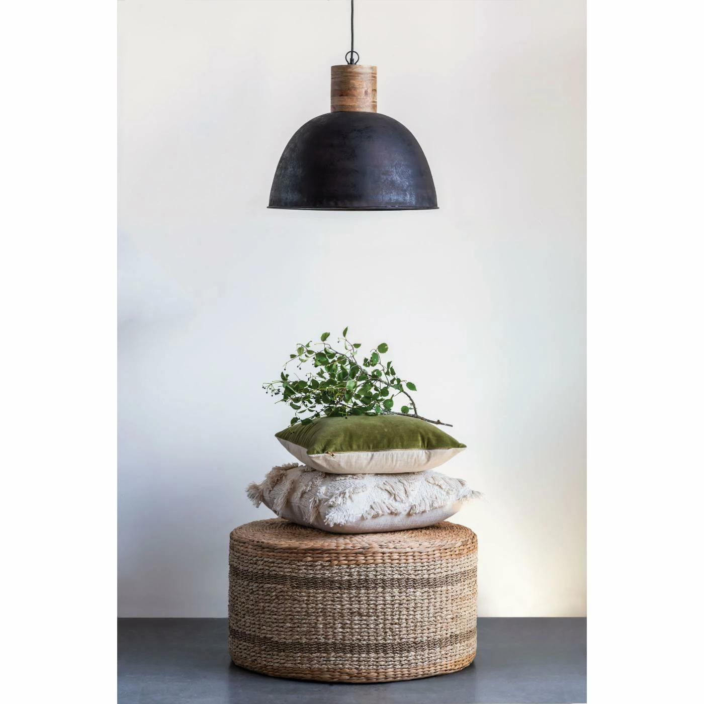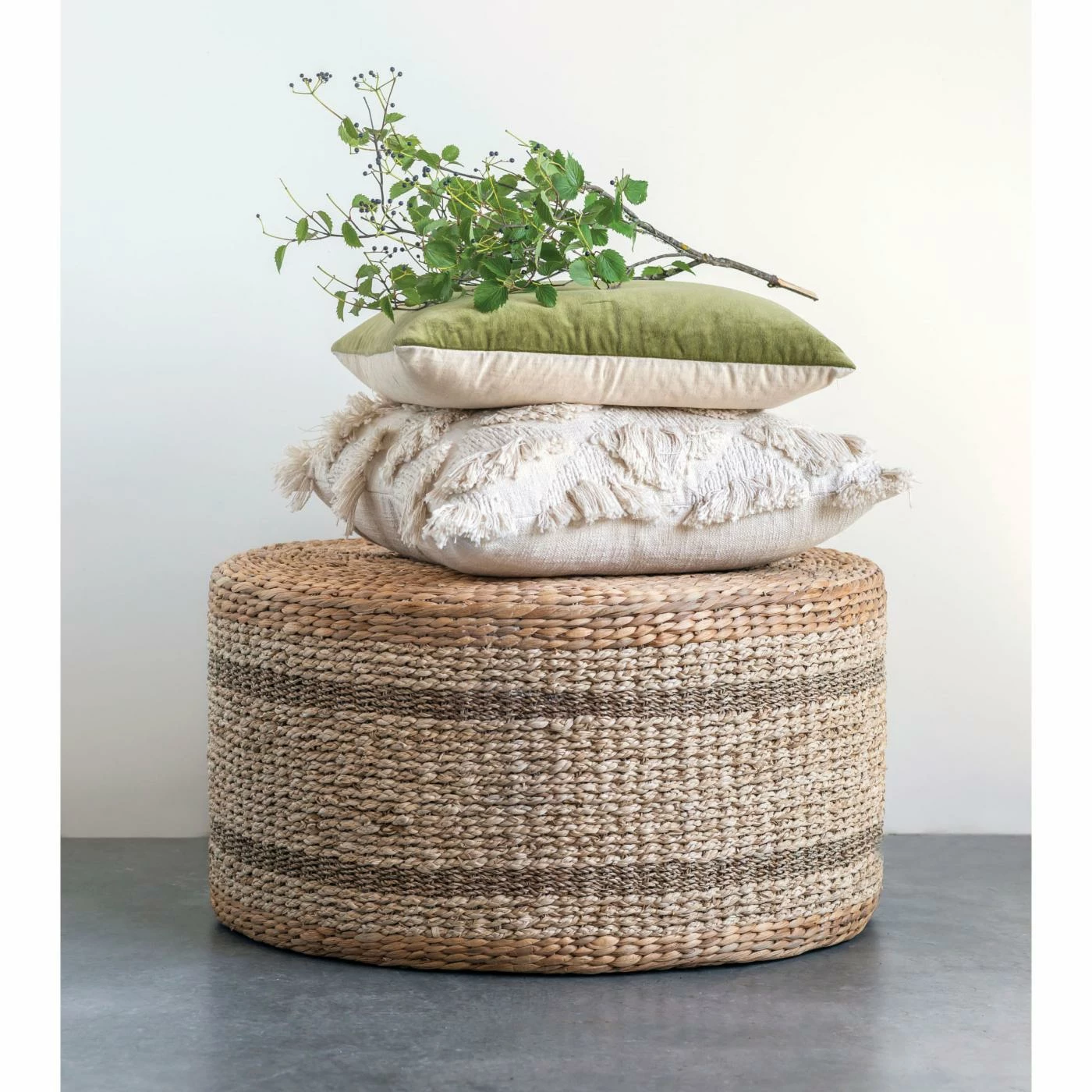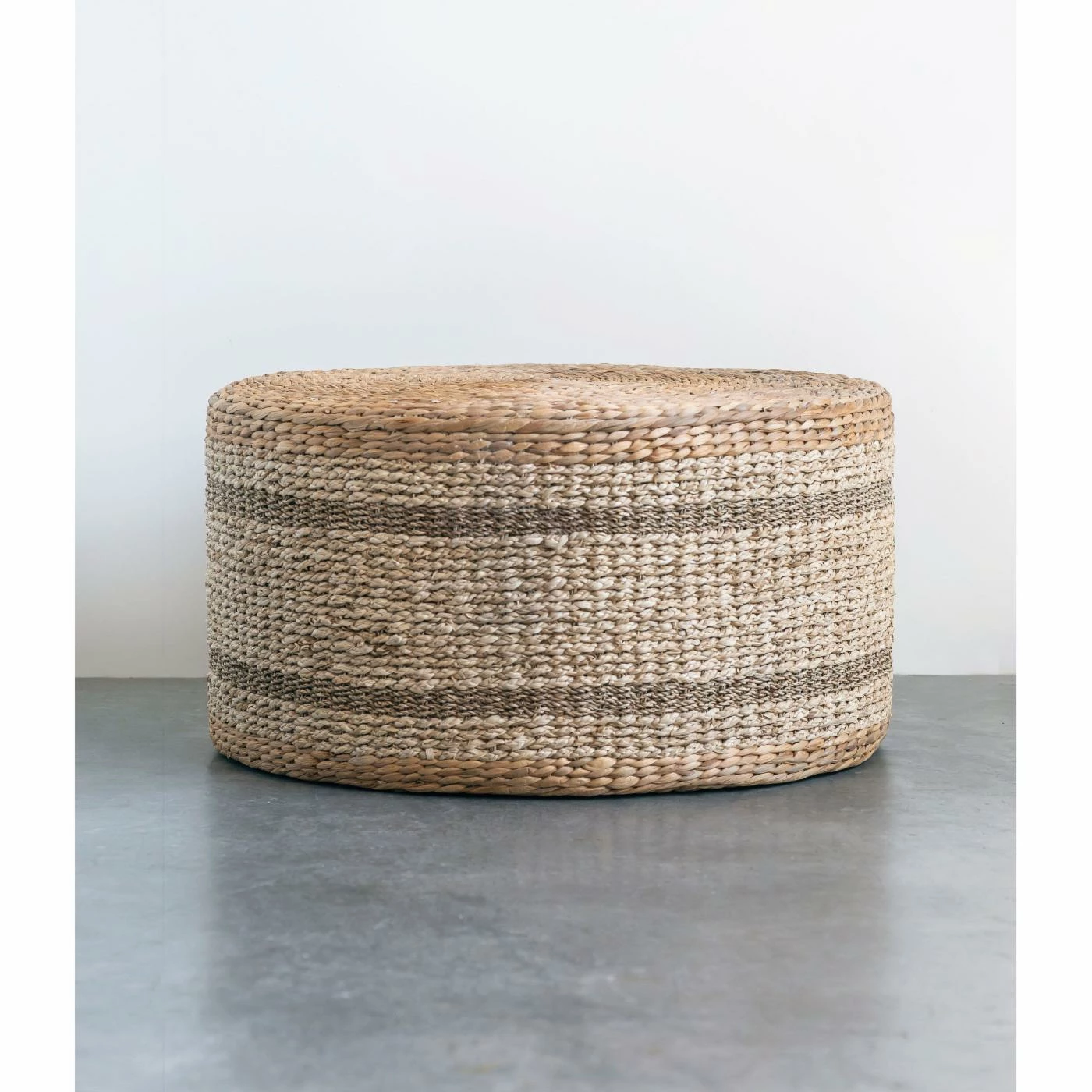 Offer your living room a relaxed centerpiece that’s a natural perch or plants, throw-pillows, and more. The 3R Studios Striped Round Water Hyacinth and Seagrass Coffee Table Ottoman has a wide, round shape woven from a combination of seagrass and water hyacinth for a tight, durable design. The blend of materials fives this a light brown color with a darker top and gray stripes.
