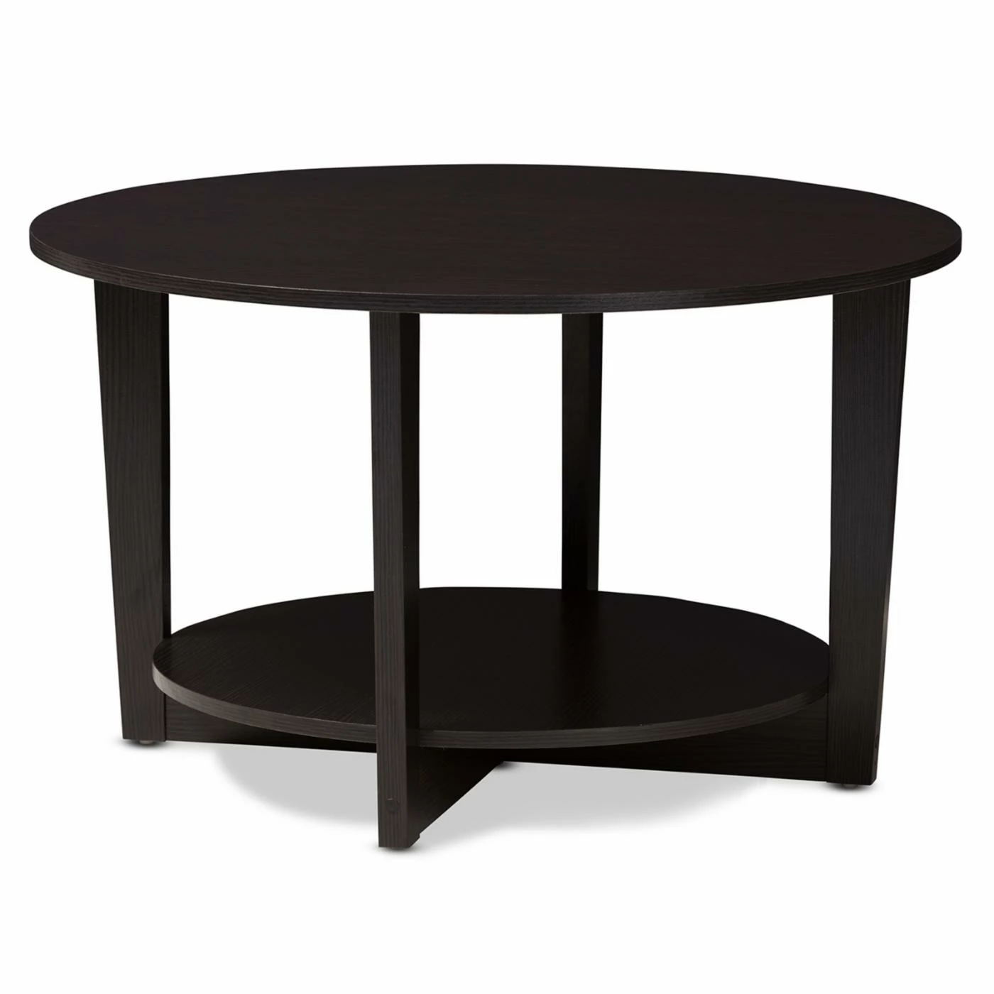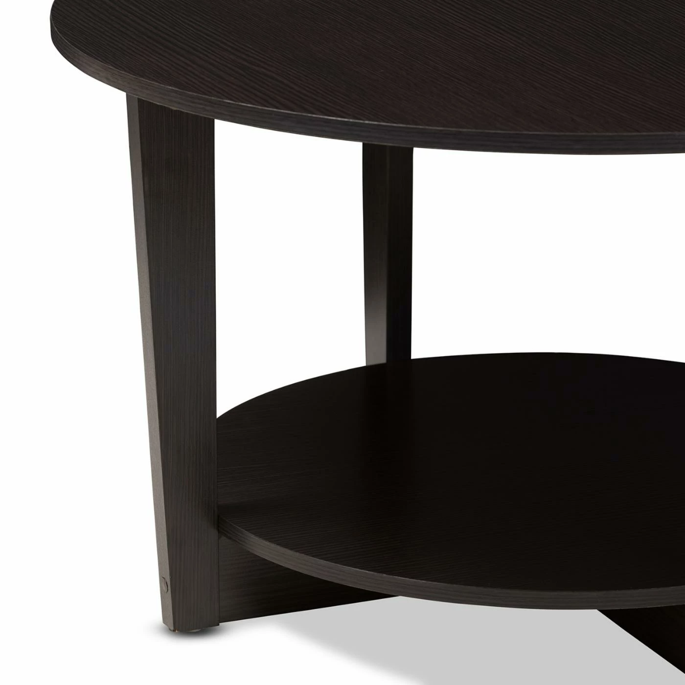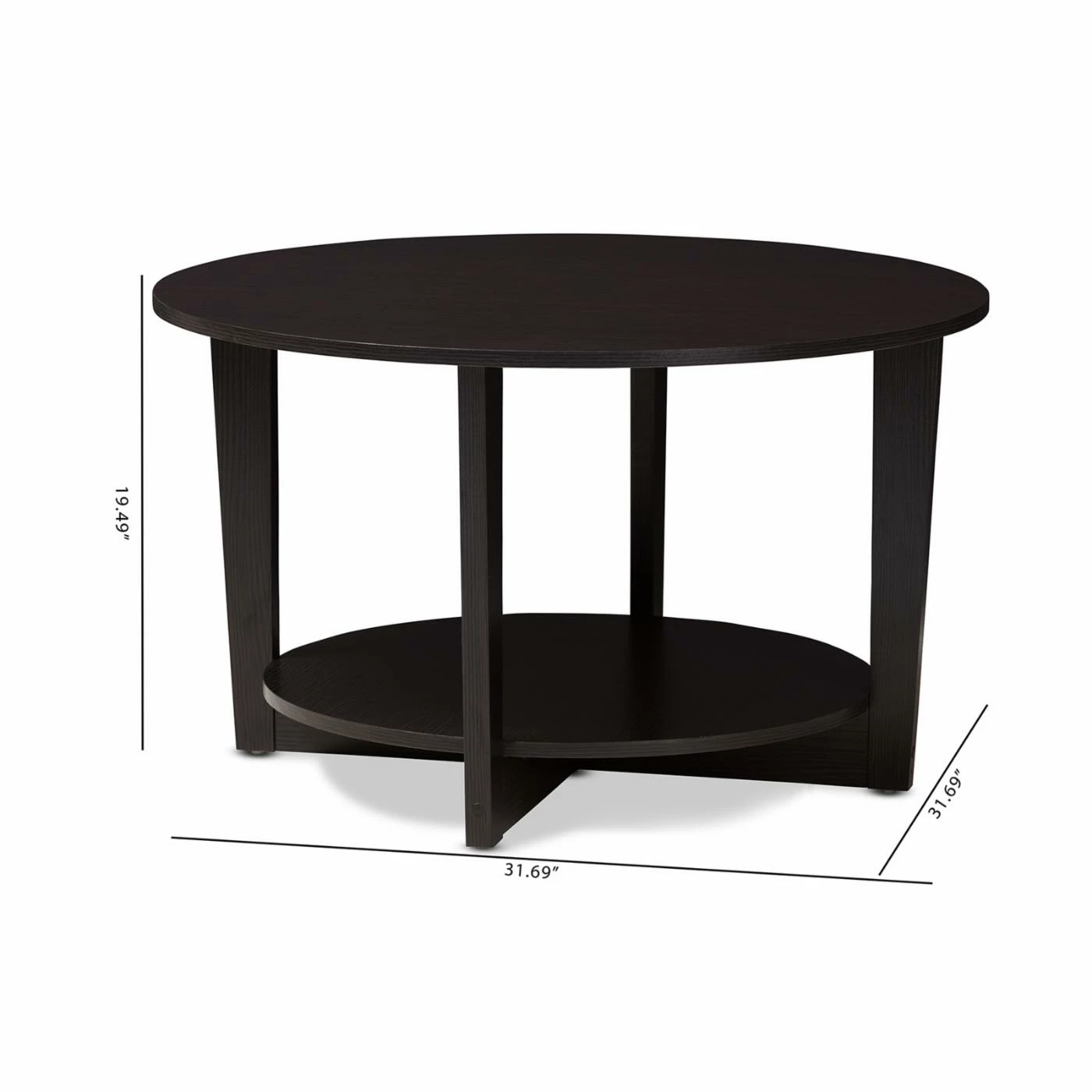 The Baxton Studio Belina Round Coffee Table wows with its clean-line aesthetic and deep espresso finish. The engineered wood craftsmanship ensures enduring beauty. The perfectly circular tabletop and lower shelf of this coffee table are ideal for storing and displaying household items.