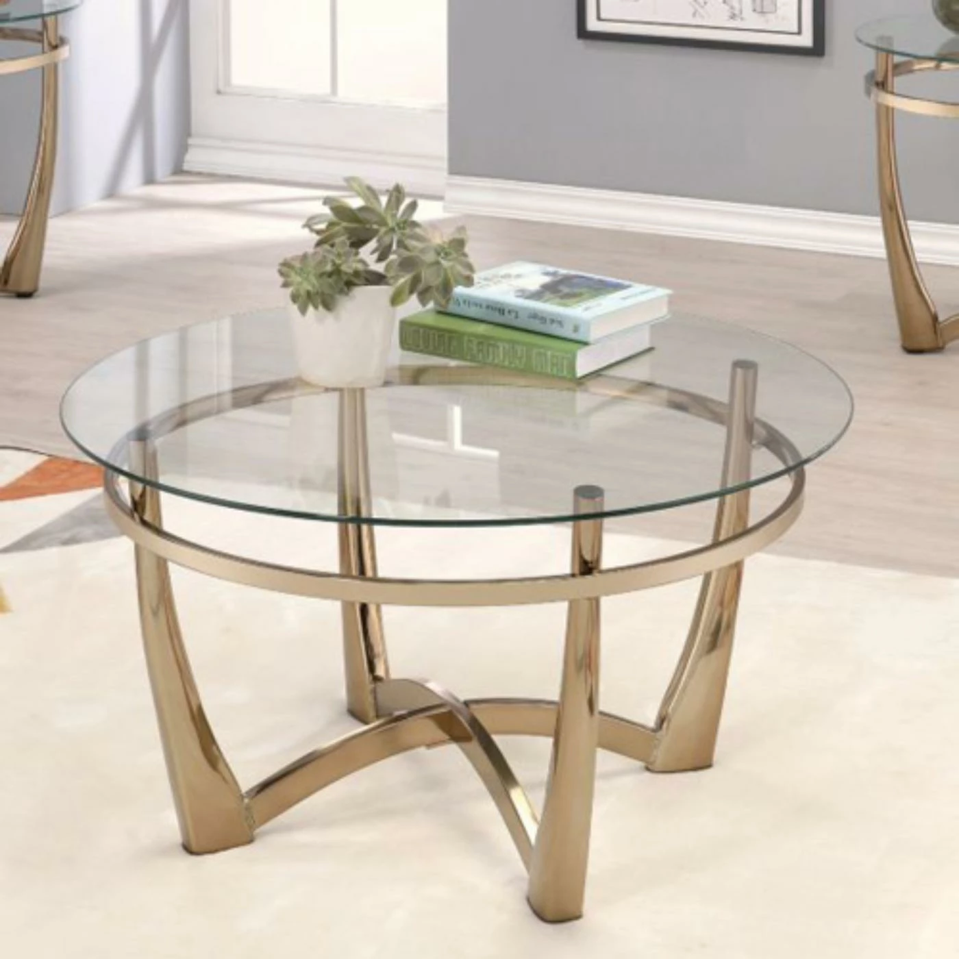 Upgrade your contemporary glam living space with the Benzara Attractive Round Glass Top Coffee Table. Curved legs and a raised X-shaped stretcher on this coffee table are finished in gleaming gold. A round, clear glass top offers plenty of display space and works well with sectional sofas.