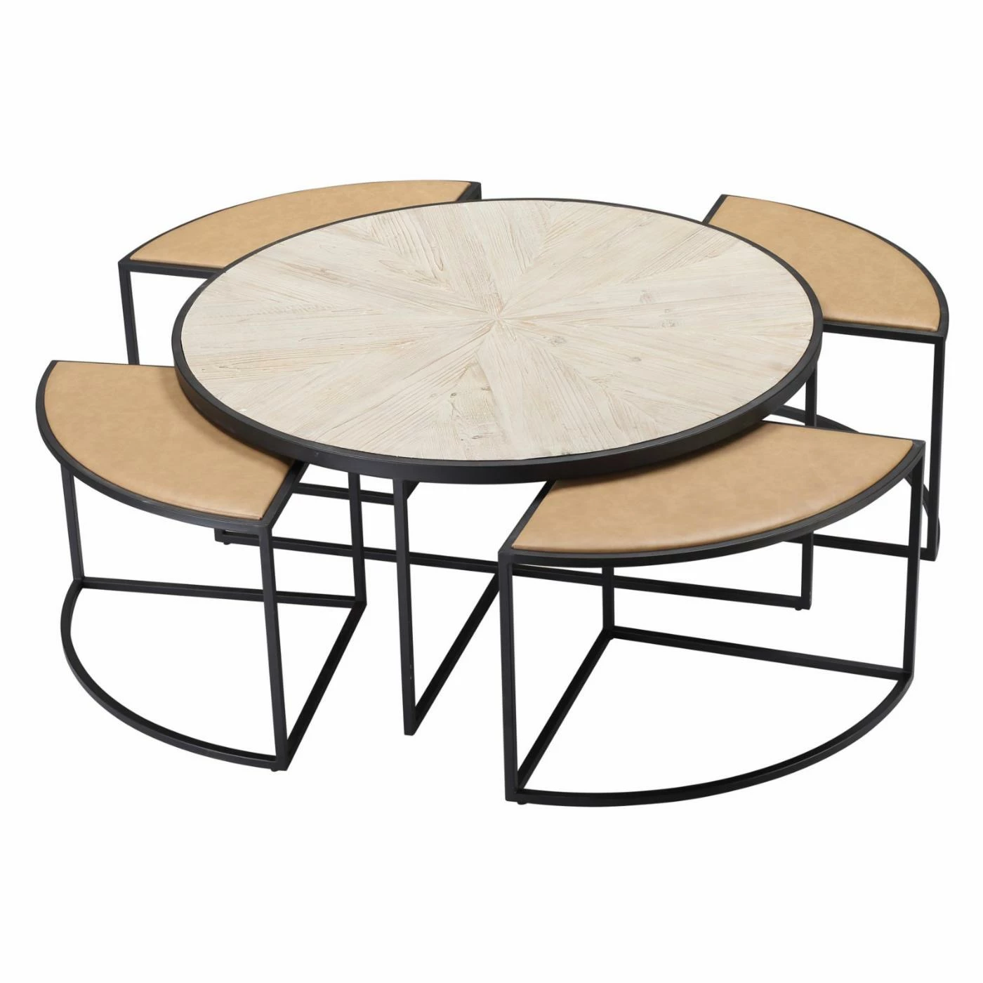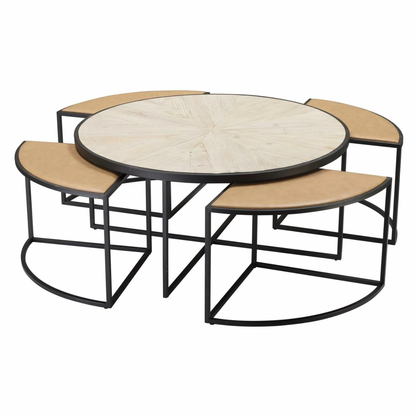 Look no further, the Burnham Home Designs Olivia Round Coffee Table with Stools is a versatile addition to your living room space. This generously sized round coffee table features four matching stools that nest underneath. Black metal frames support a natural pine wood table top and tan leather stool tops. Configure it to suit your space by using the stools for seating or as coordinating accent tables.