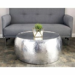 Add a touch of glamour to your living room when you use the DecMode Aluminum Coffee Table as a focal point. This contemporary coffee table boasts a hammered aluminum finish that allows light to bounce off the textured surface.