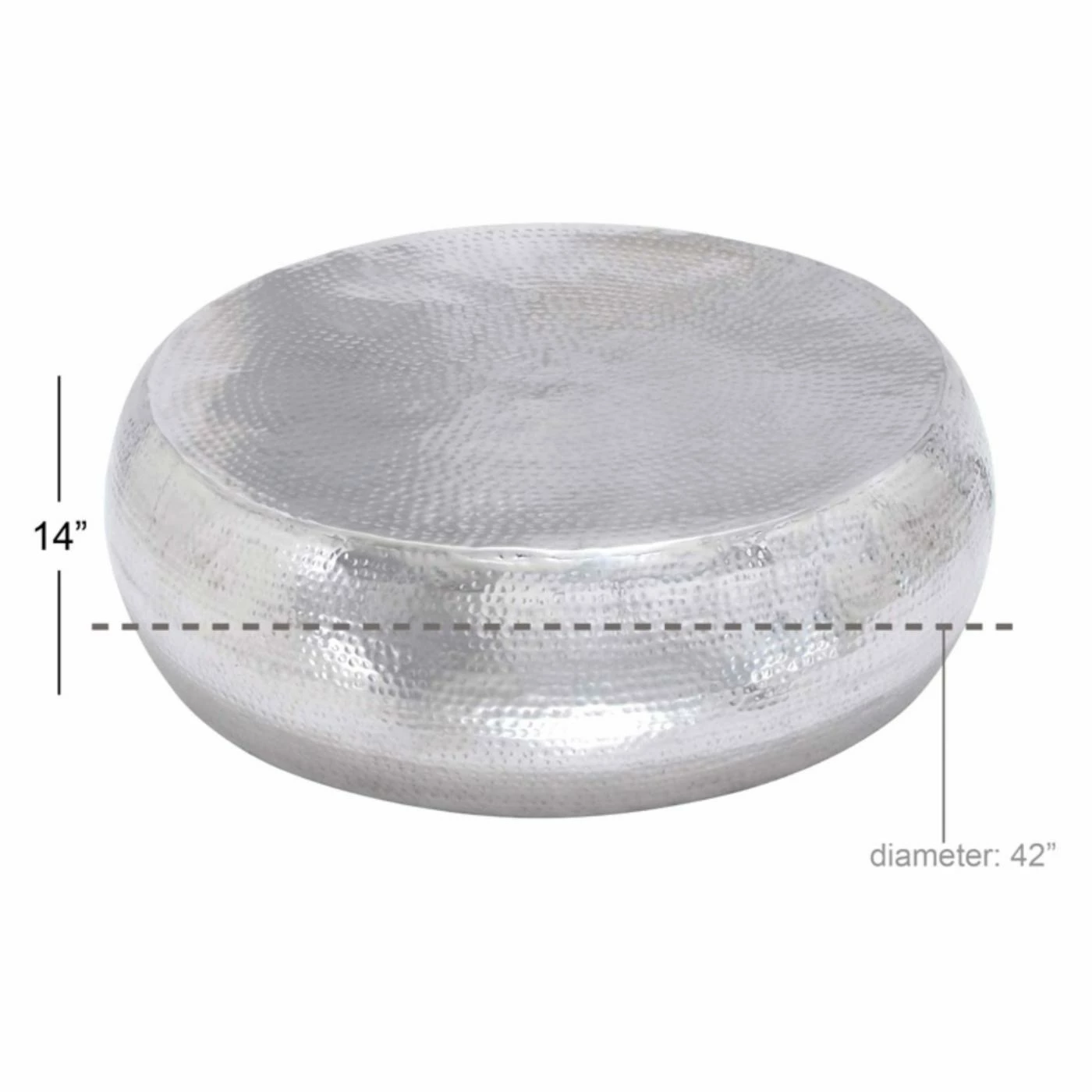 Finish your dΓ©cor with a touch of glamour, compliments of the DecMode Drum Coffee Table. Made with 5% iron and 95% aluminum, this drum table shows off a hammered texture in sleek, polished silver which works in almost any space. The table rests on a flat bottom for stability.