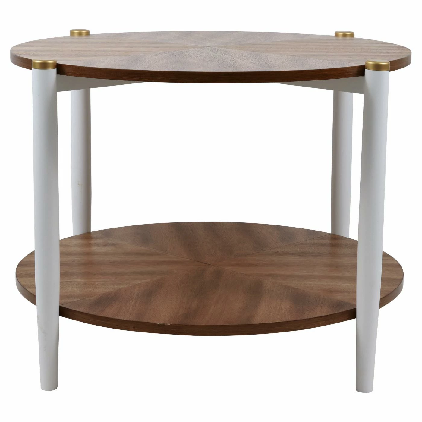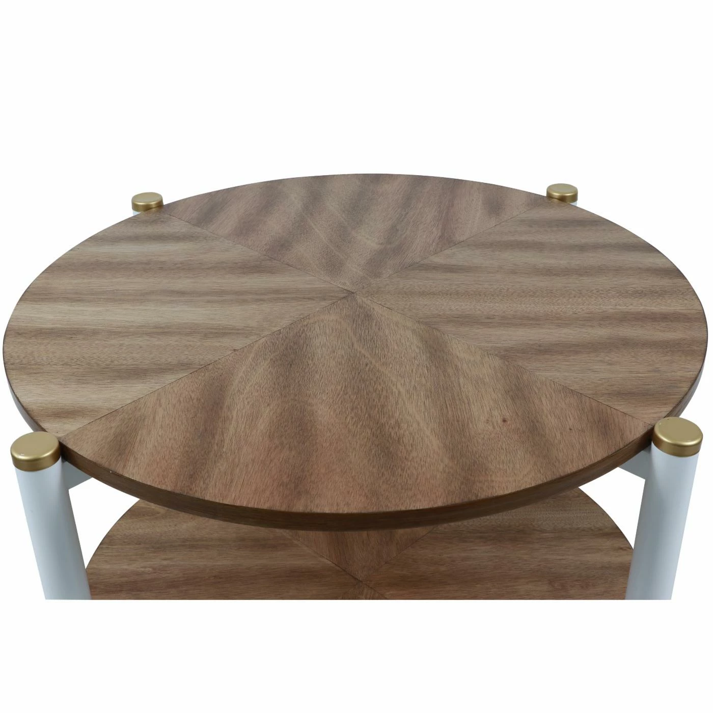 Set your living space up for success with the Decor Therapy Tonya Round Coffee Table. This charming coffee table combines natural wood tones with white and metallic accents for a chic and modern look. Two open shelves give you plenty of space for coffee table books, decorations, and drinks – just remember the coasters. Some assembly required.