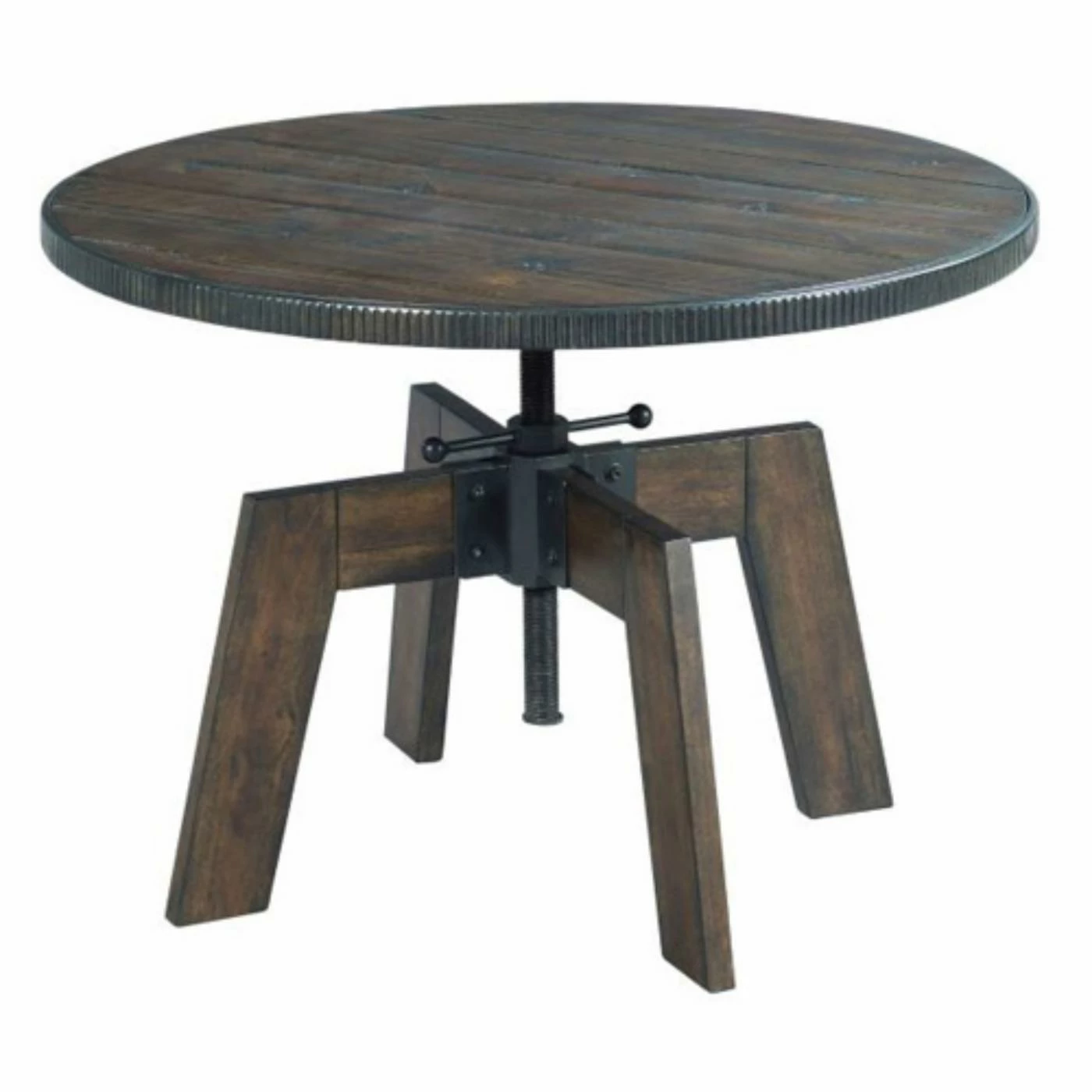 Industrial and masculine, the Hammary Hidden Treasures High Low Coffee Table makes a bold addition to your dΓ©cor. This hi-low table boasts dramatic legs featuring an adjustable acacia wood tabletop that can be spun to raise or lower the height of the piece. A rich brown finish and metal accents enhance the rustic quality of this table. The unique design makes this table as versatile as it is stylish. Spin it up to raise a snack to a comfortable level or lower the piece for a less obtrusive look.