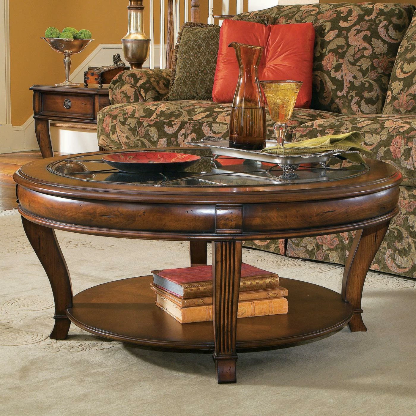 An ideal addition to your living room furniture, the Hooker Furniture Corporation Brookhaven Round Cocktail Table is a stylish and sophisticated table. This cocktail table is made of hardwood solids and cherry veneers, which give it strength and durability. Featuring a glass insert top, fluted and shaped legs and a beautiful finish, this table is a visual delight. The table has a lower shelf for storing books, newspapers or magazines.