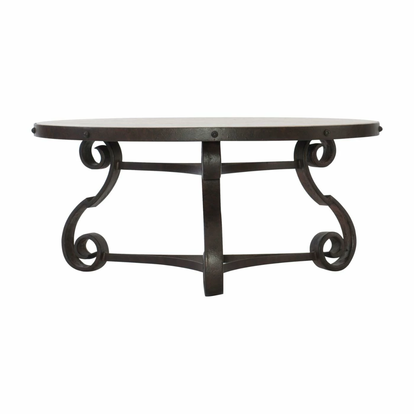 The Hooker Furniture Hill Country Luckenbach Round Cocktail Table embodies a time when a good piece of furniture expected to have a life that was measured in decades. This antique-inspired table has a base made from thick straps of curved iron with a black finish and rivets around the top. Inside that metal ring is a thick slab of natural travertine. The solid black of the metal is contrasted by the flowing, patterned look of that antique stone. This table is certainly tough enough for any area in your home.