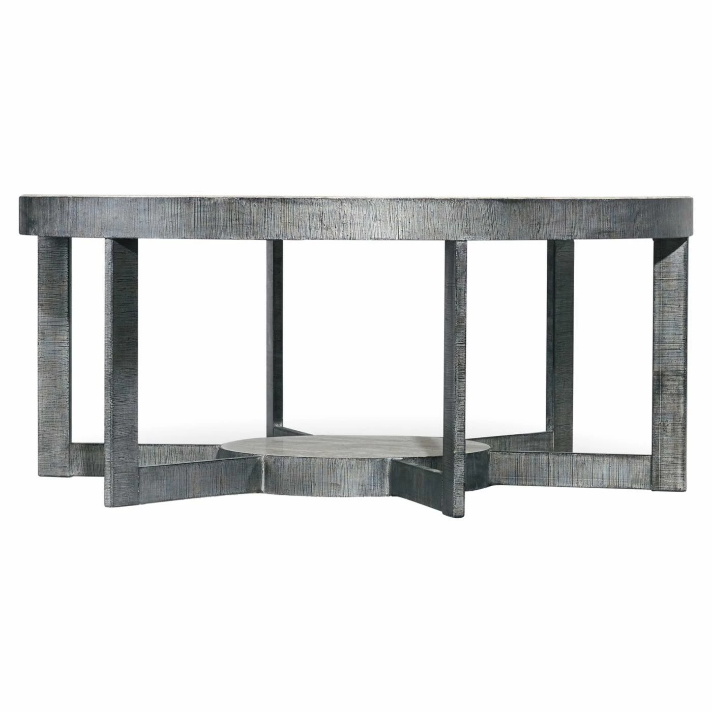 Geometric shapes and an industrial design create the Hooker Furniture Mill Valley Round Cocktail Table. Completing the look of this travertine table is the distressed gray finish.
