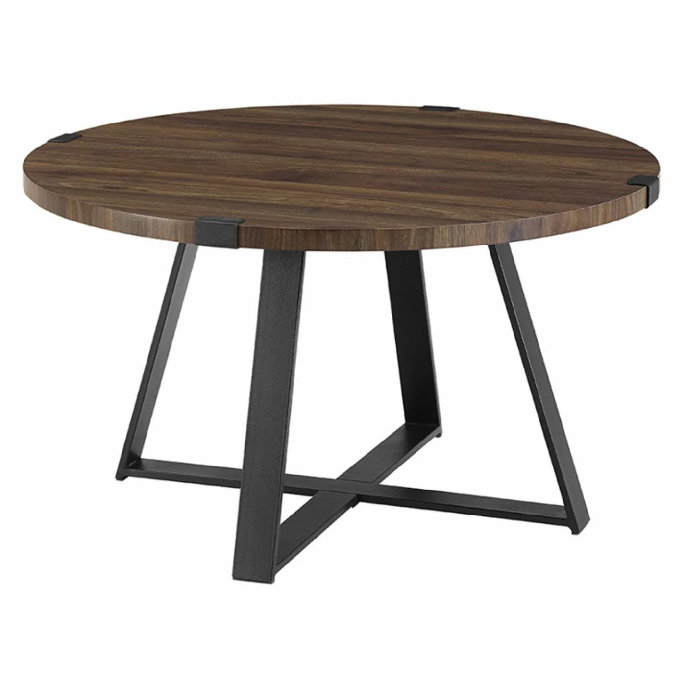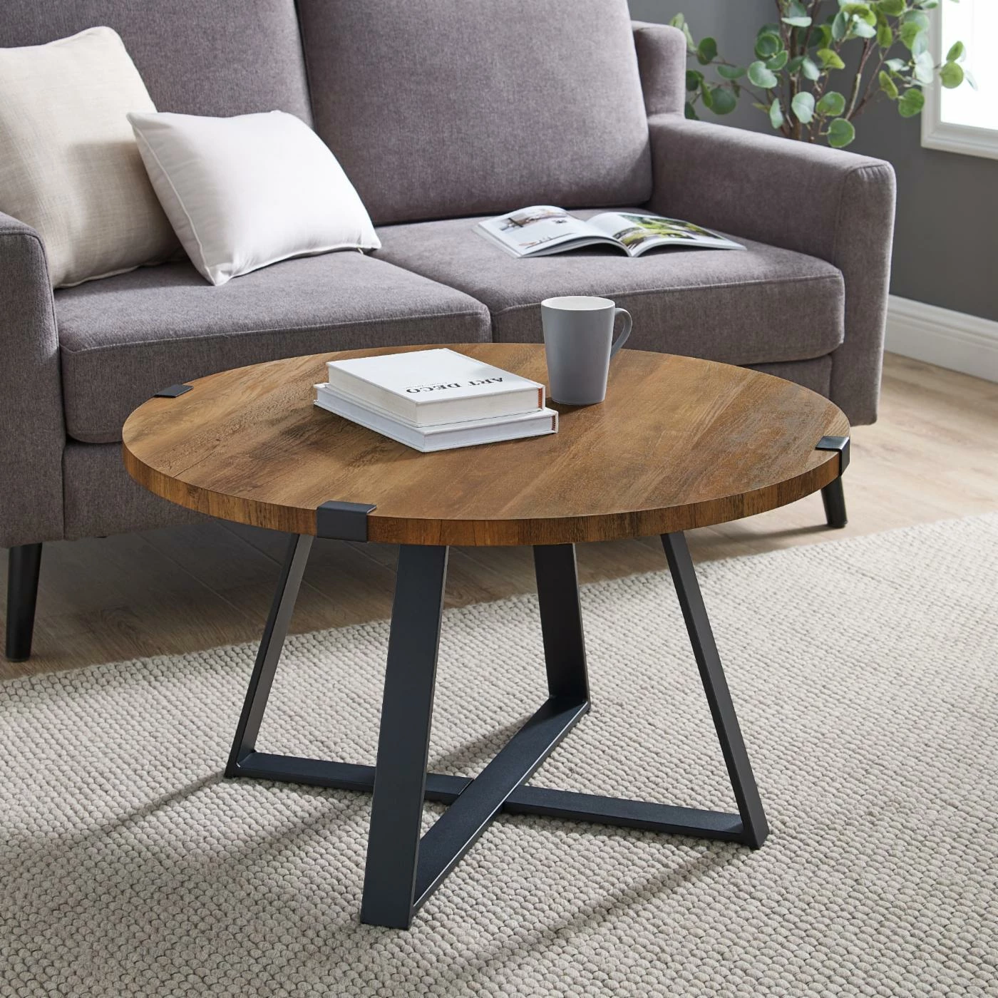 The HumbleNest Countryside 30 in. Round Rustic Coffee Table brings modern farmhouse style into your home. This round coffee table boasts a laminate wood top available in your choice of available select options. It’s supported by a durable metal base that wraps around the table top for structure and stability. Assembly required.