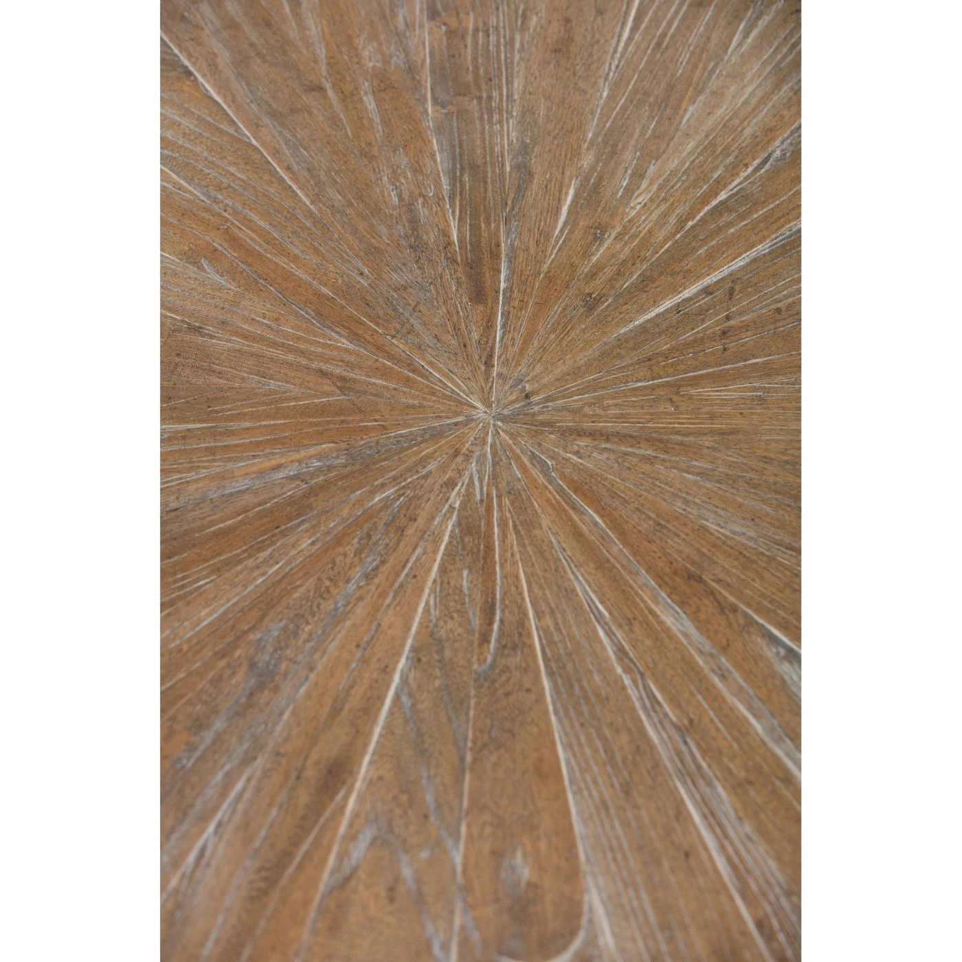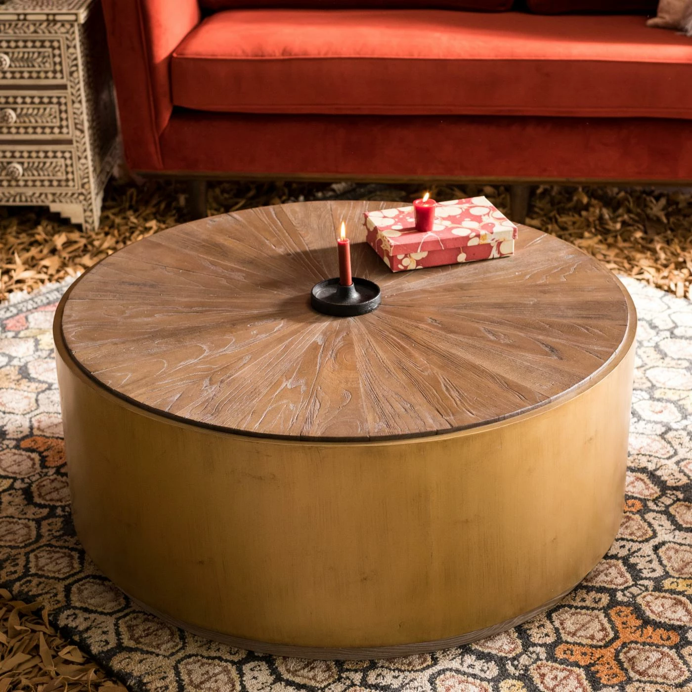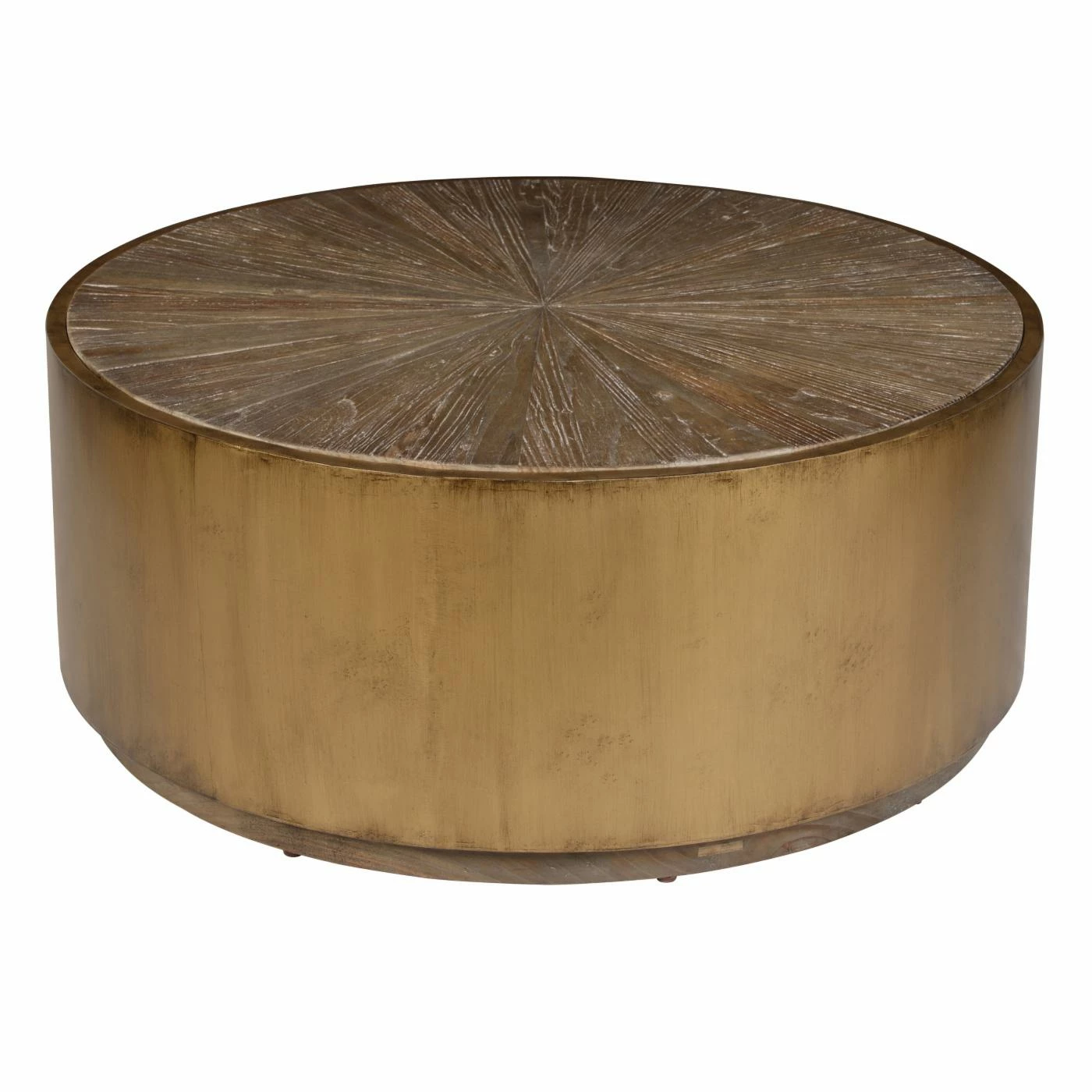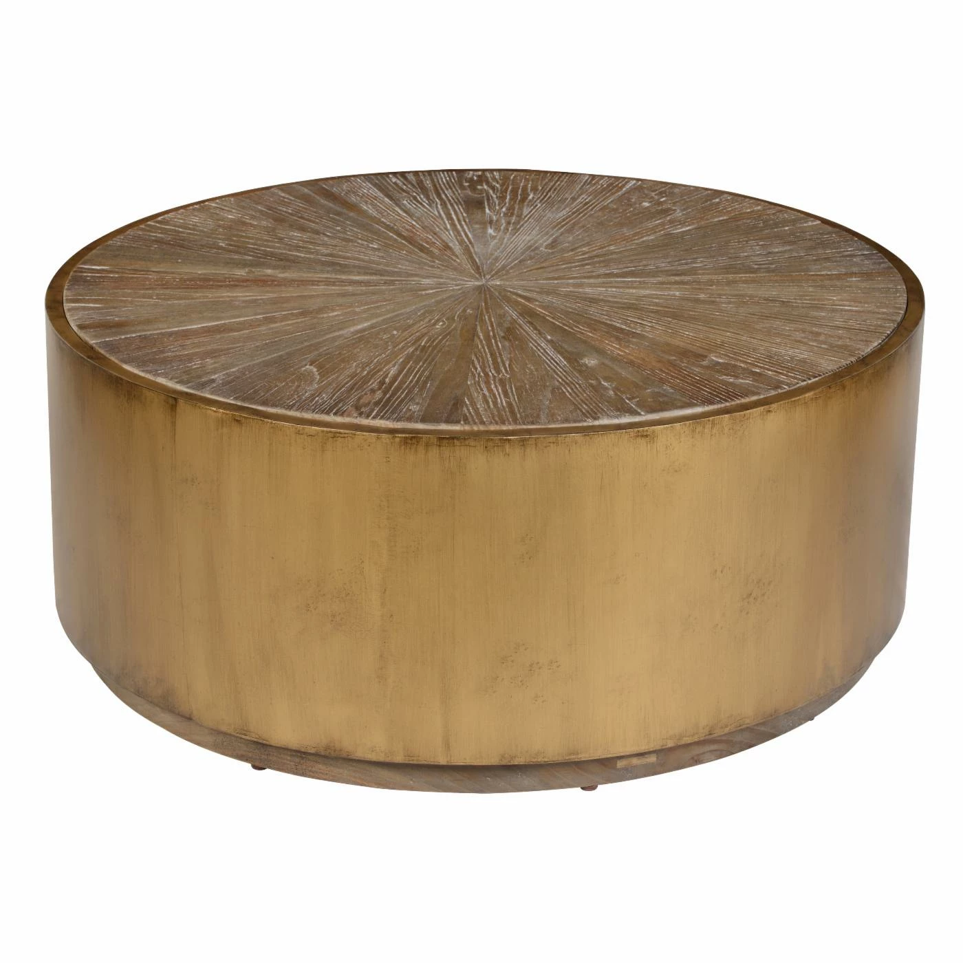 Go rustic glam in your living room with the Kosas Home Salsbury Coffee Table. This mixed media centerpiece pairs a reclaimed elm wood top with an iron base in an antique gold finish. The elm is hand-finished and distressed for a vintage vibe, and the gold base has a light patina that still keeps its metallic shimmer. This circular coffee table is sure to be a standout piece in your living space.