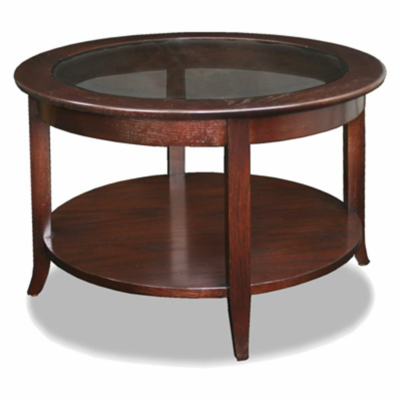 Add a contemporary flair to your home decor-style with the Leick Home 10037 Favorite Finds Round Coffee Table. Featuring a compact size, this space-efficient table is designed to make the most of spaces that are small. A spacious top is great for displaying artifacts, while the bottom shelf provides convenient storage. Its tough construction of solid ash makes it sturdy and durable. In addition, the splayed sabre leg, bronze tinted glass, and chocolate oak finish add to the visual appeal of the table.