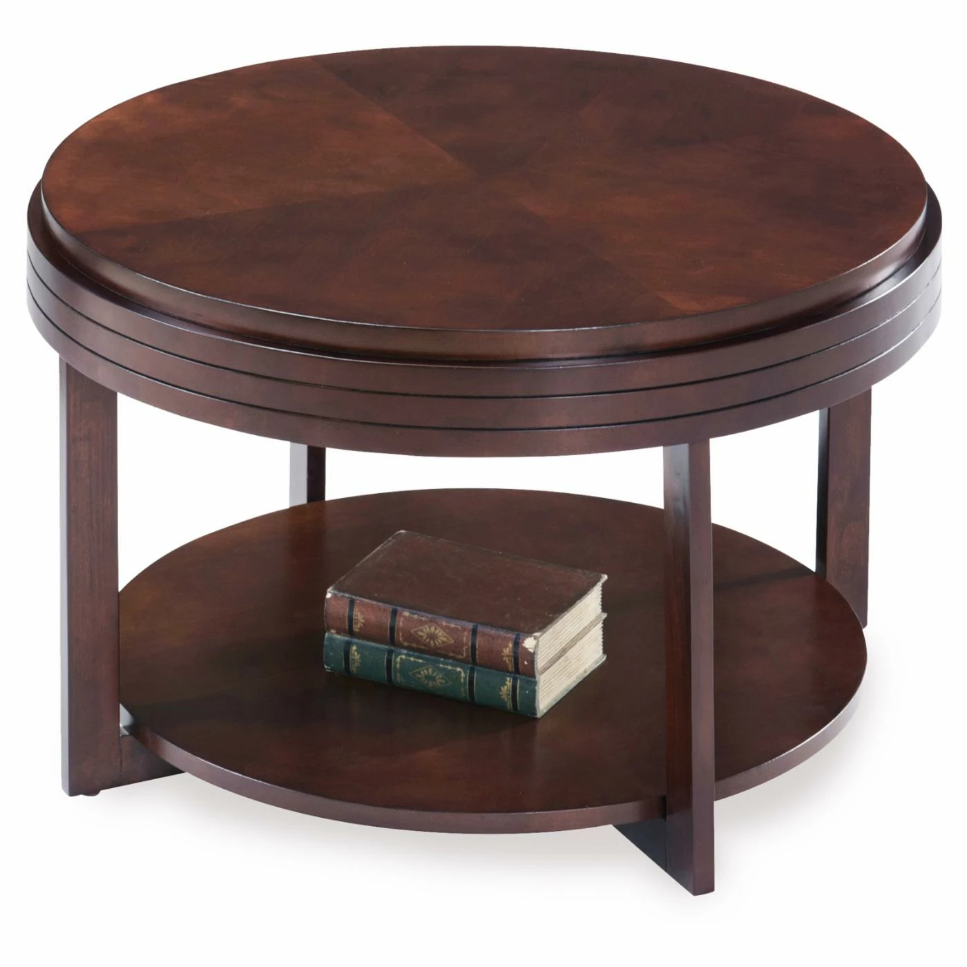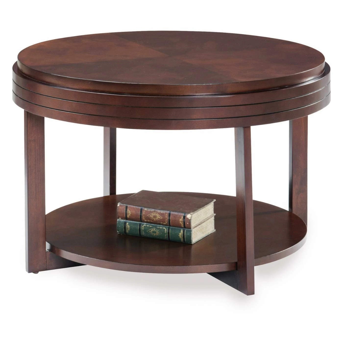 The Leick Home Chocolate Cherry Round Condo/Apartment Coffee Table makes it easy to create a fashionable focal point in a smaller living space. The grooved apron frames the diamond matched veneer top, while below, a lower shelf provides handy storage and display space. The coffee table is crafted of solid hardwood with birch veneers in a hand-applied chocolate cherry finish.