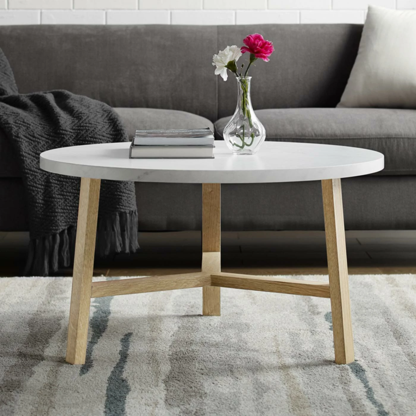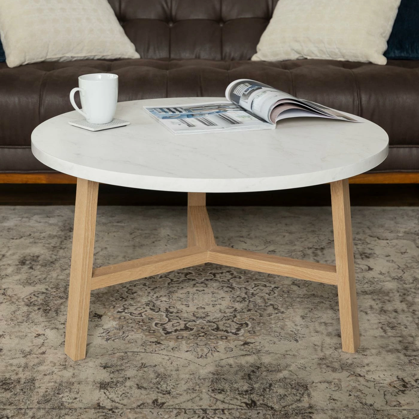 - Round white faux marble tabletop