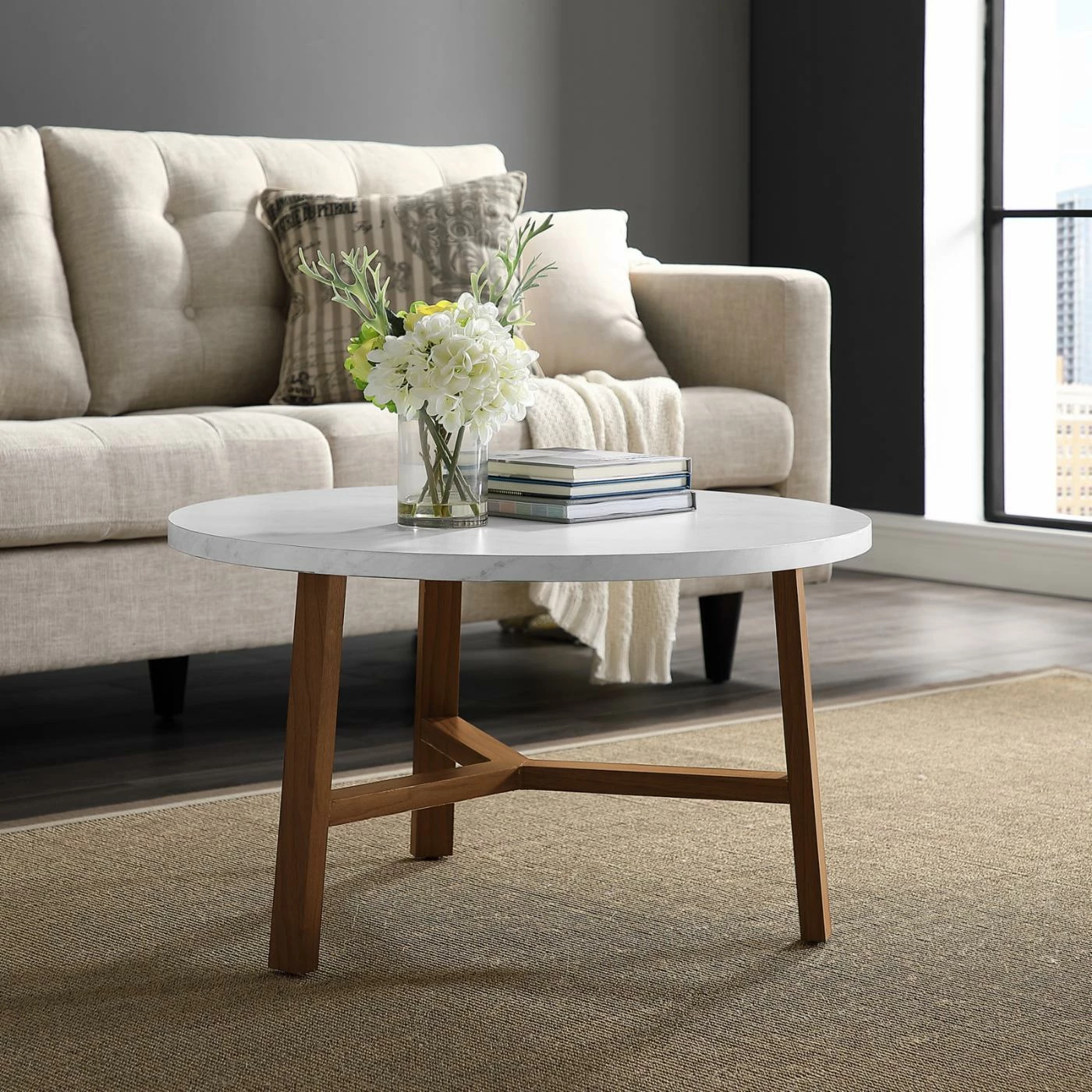 The Manor Park Mid Century Modern Round Coffee Table proves that form and function are synonymous. The generously sized tabletop is large enough to hold drinks and appetizers for your next party, or a board for game night. The white faux marble tabletop contrasts beautifully with the natural pattern of the wooden legs, which come in your choice of available colors. Clean, sleek lines dominate this mid-century-inspired design.