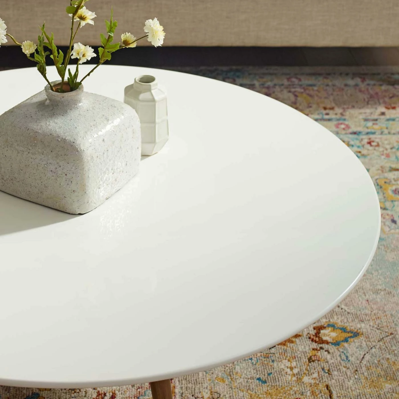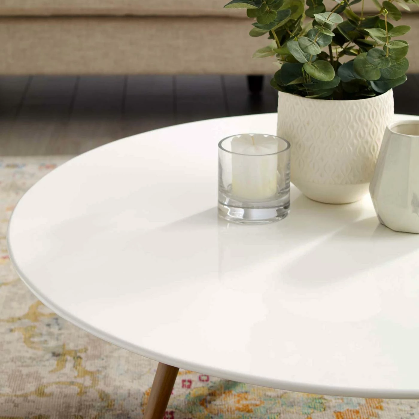 Bring sleek, modern style to your living room with the Modway Lippa Round Top Coffee Table with Tripod Base. The round, engineered wood top is in a lacquered white finish that is scratch-resistant. Dowel legs arranged in a tripod add to the table’s contemporary silhouette.