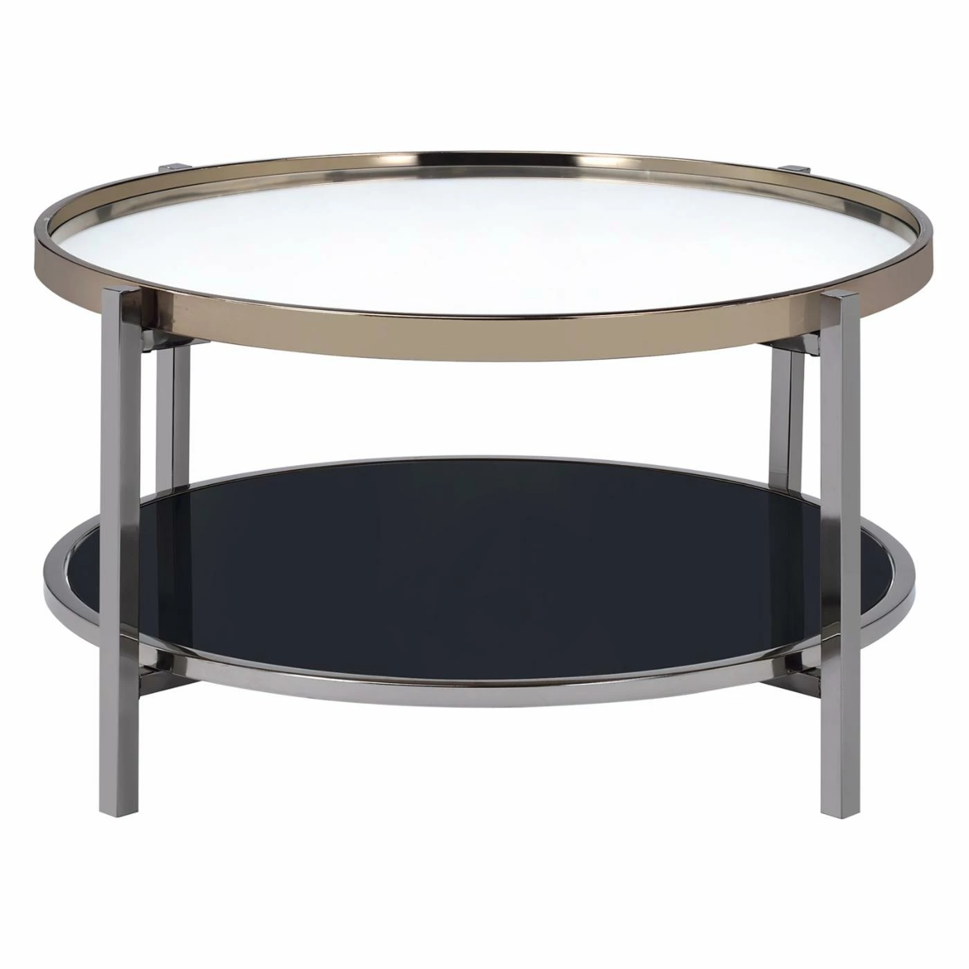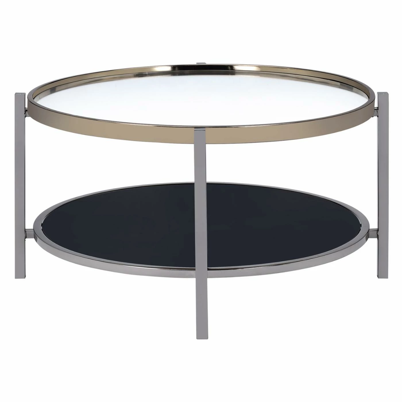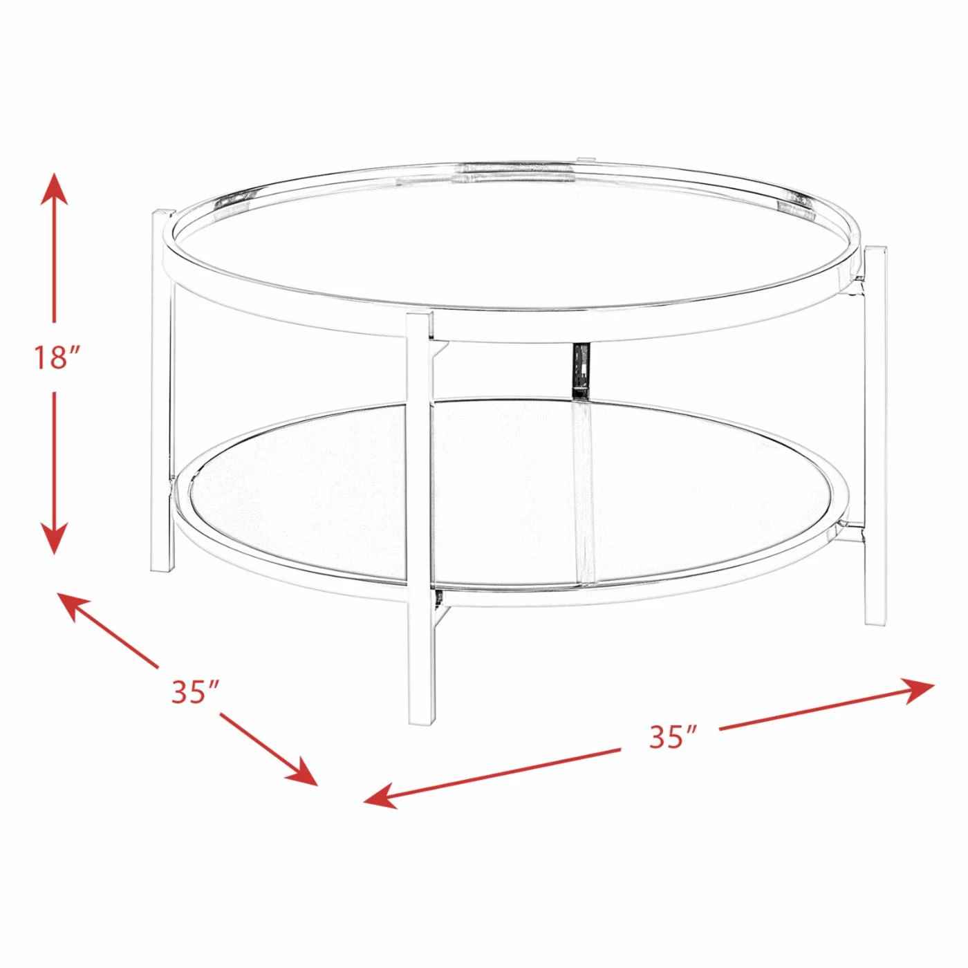 The Picket House Furnishings Monaco Round Coffee Table features a mirrored top trimmed in polished gold and a black tempered glass lower shelf. A silver framework lends stylish stability to this coffee table.
