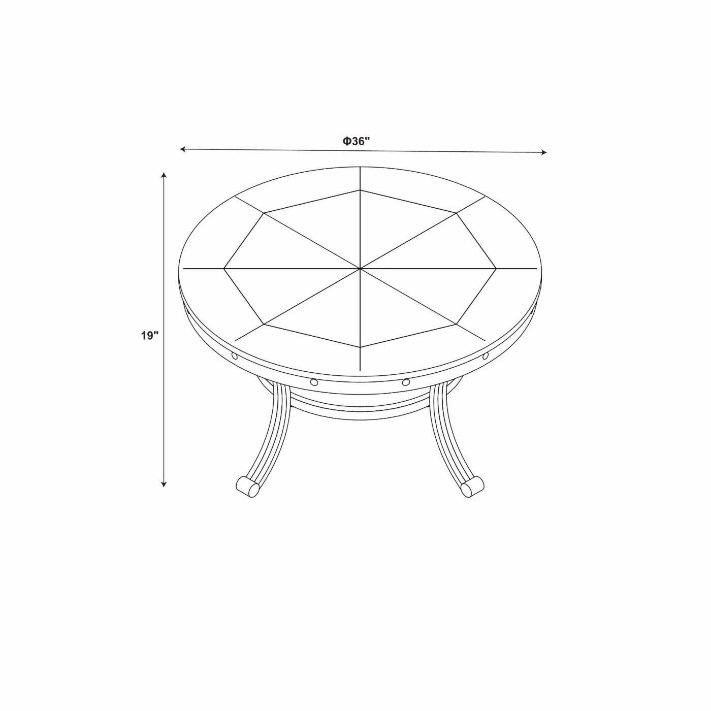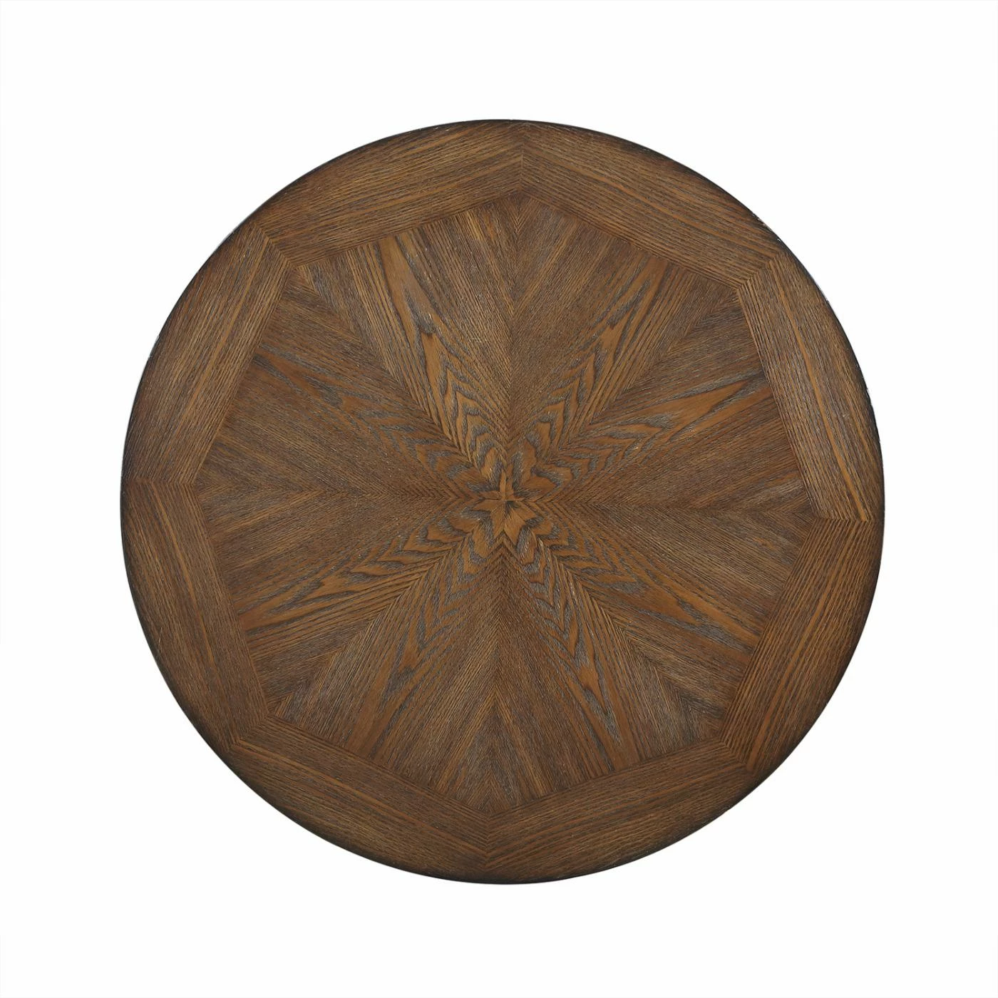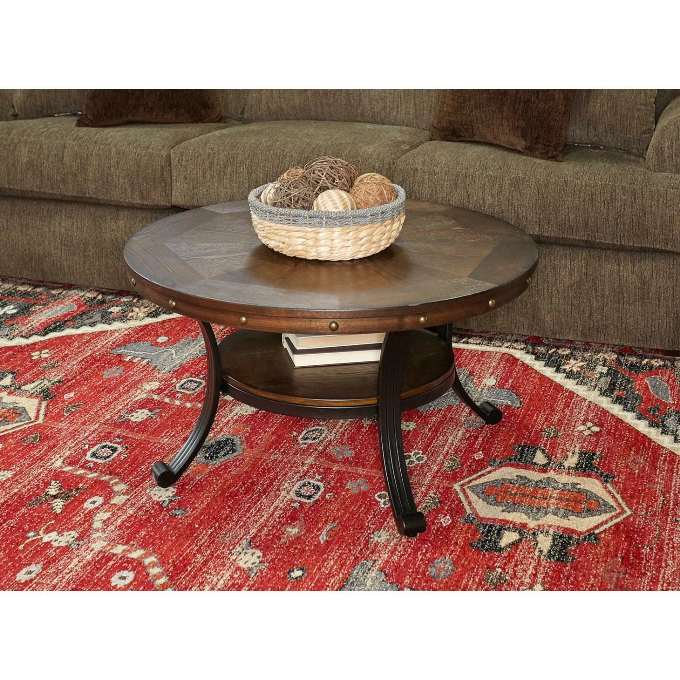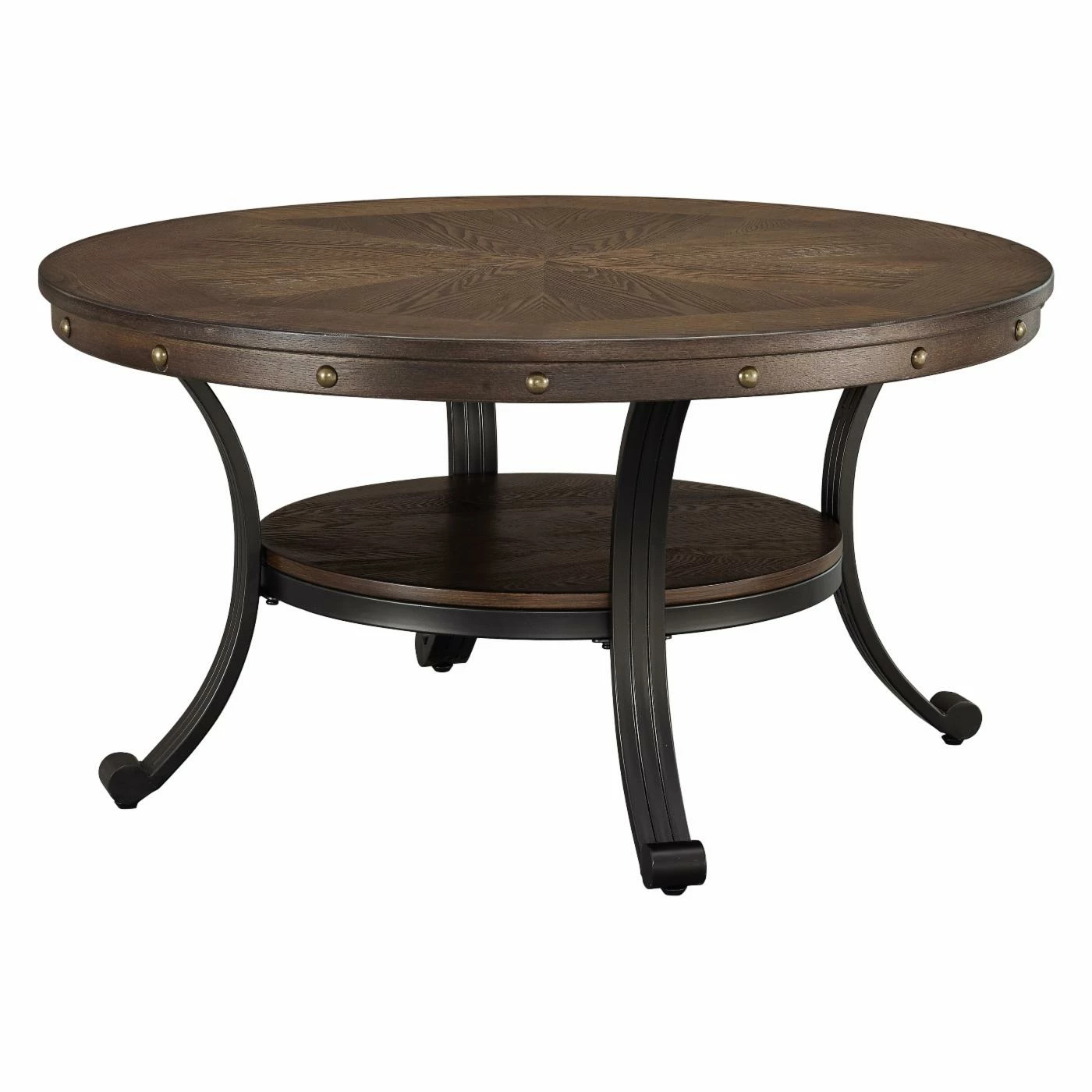 Inspired by traditional parquetry tables, the Powell Franklin Cocktail Table adds Old World elegance to interiors. Its round top shows off oak wood grain veneers and is accented by nail head trim along the outer rim. Constructed out of sturdy metal, the legs curve away from the top and are completed by rounded feet. A lower shelf provides a convenient secondary storage space beneath the top.
