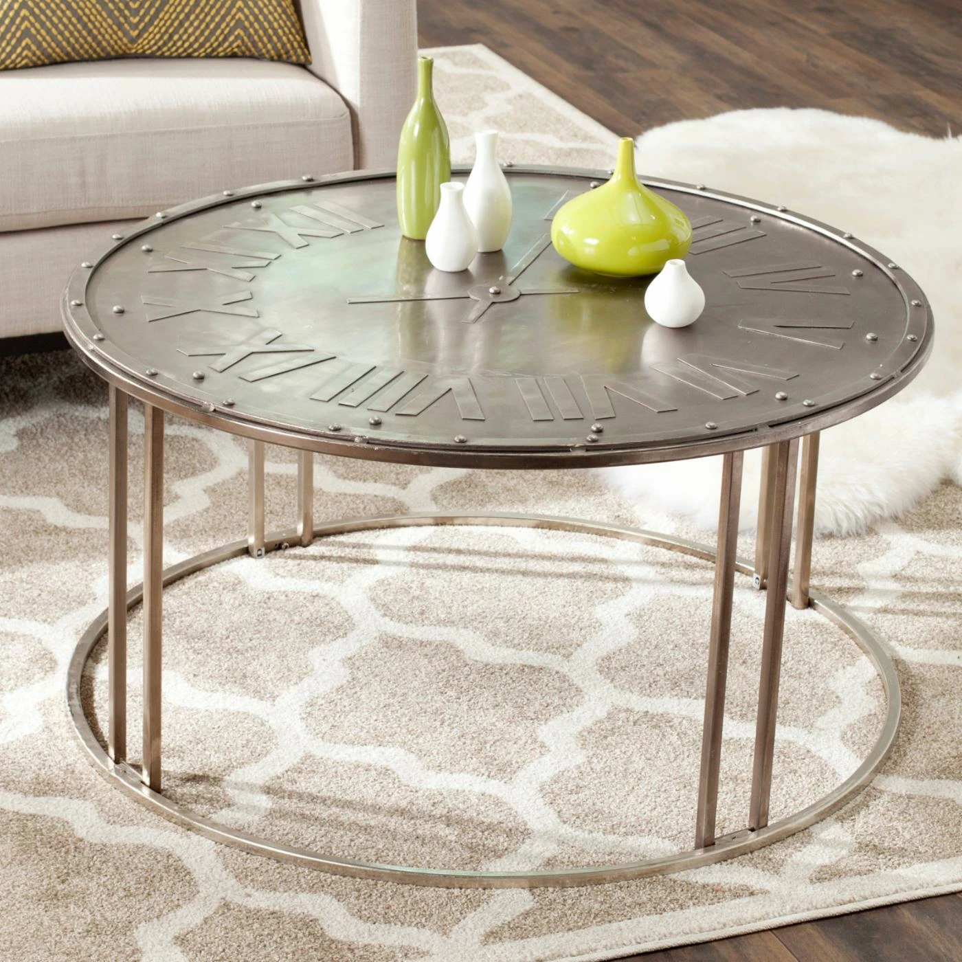 Spark conversations with the Safavieh Roman Clock Cocktail Table. Fabricated out of engineered wood, the round top resembles the face of an antique clock with raised Roman numerals and hands. Riveted accents add industrial appeal to the dark antique silver piece. Completing the design is a sturdy base crafted out of square tubular iron.