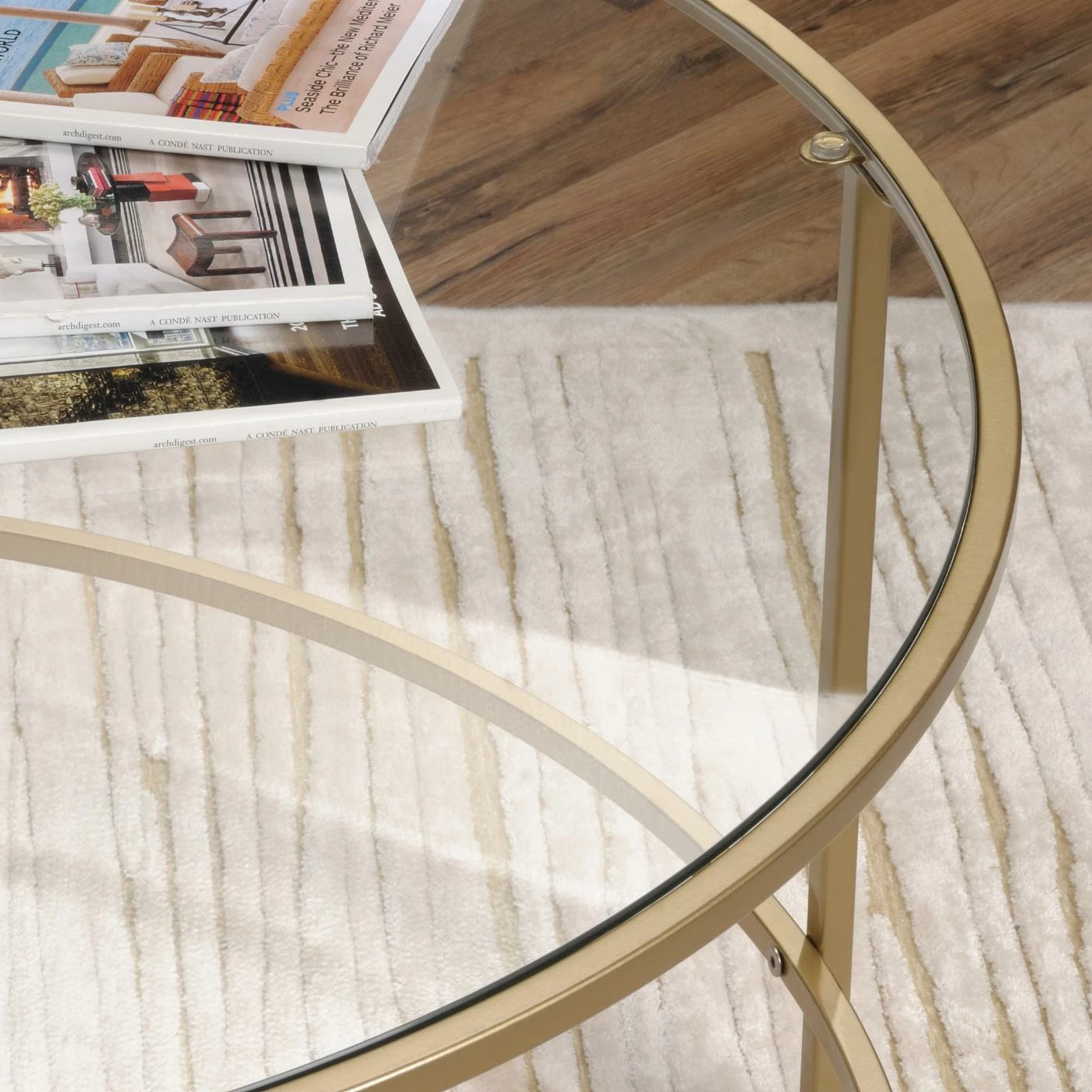 Enjoy the glam contemporary look of the Sauder International Lux Round Glass Topped Coffee Table. This round coffee table features a satin gold metal frame and tempered glass tabletop. It is finished on all sides for ideal placement anywhere in your home.