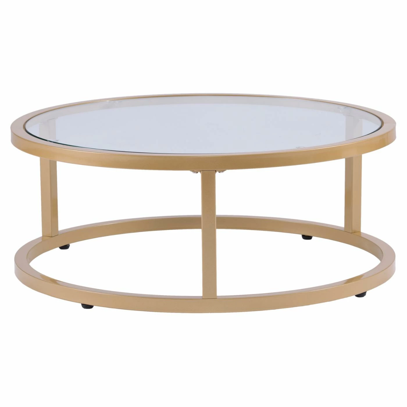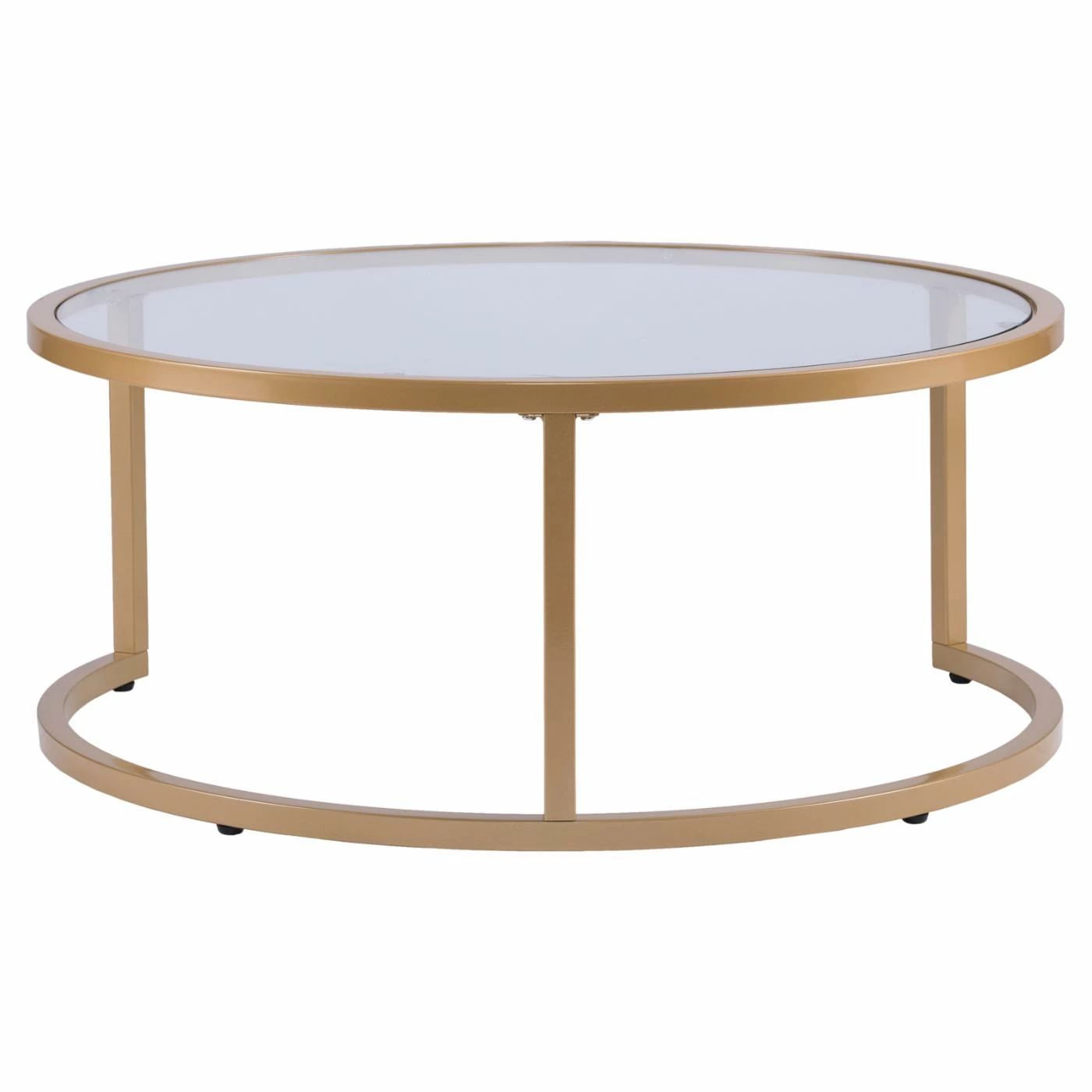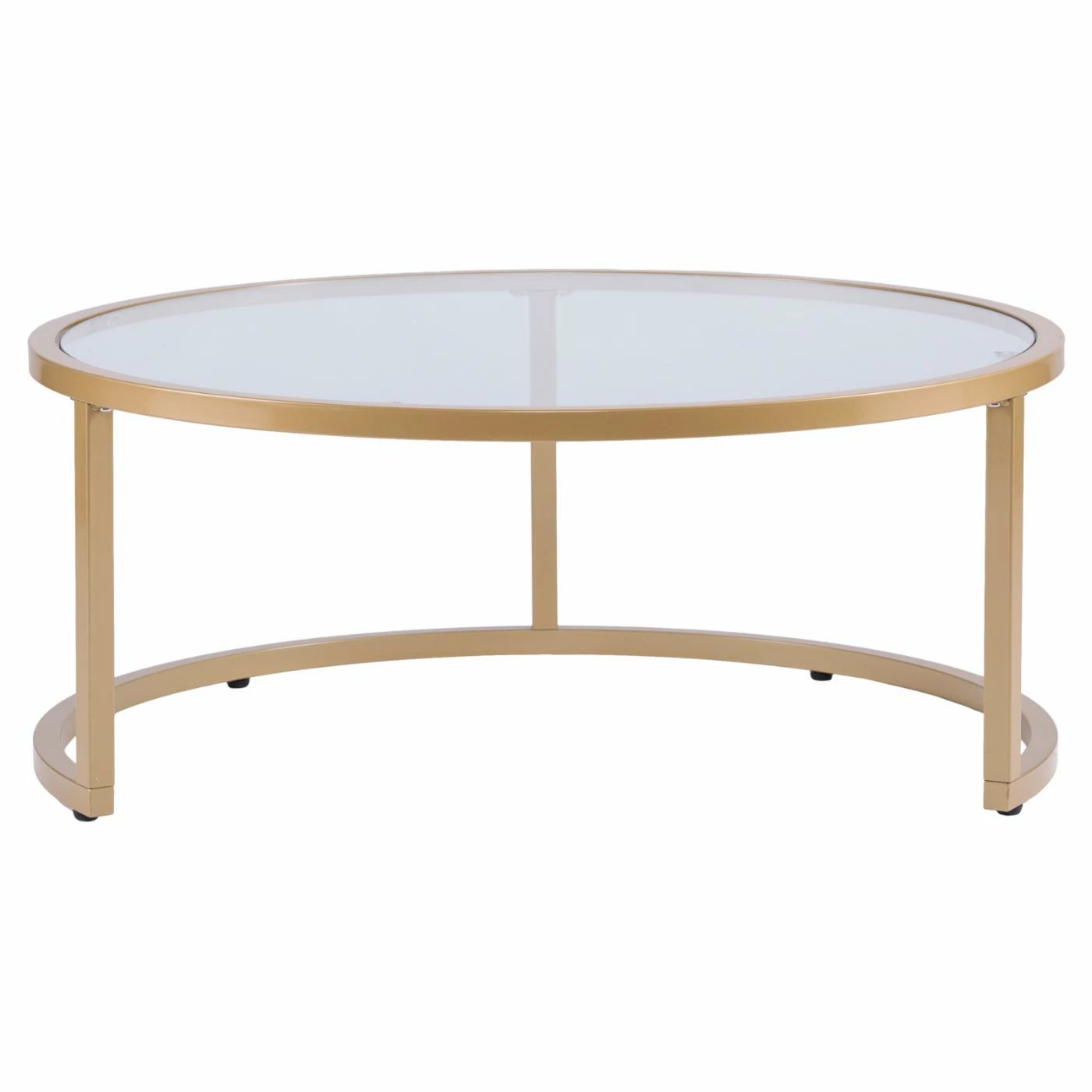 The Southern Enterprises Evelyn Nesting Cocktail Tables adds a glam element to your living room. The rounded glass surface is supported by a slender metal frame in gold. The two tables nest together to save space when not in use.