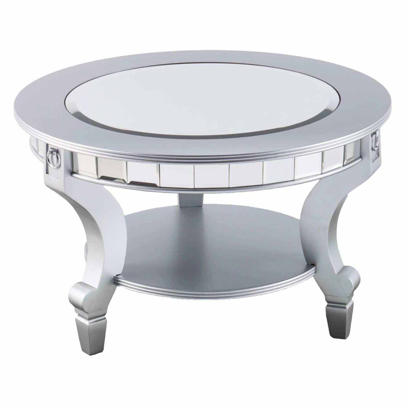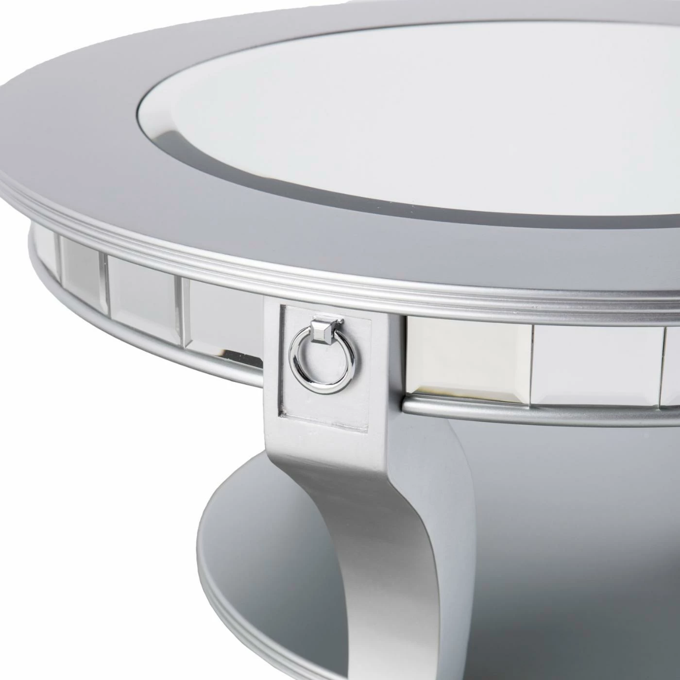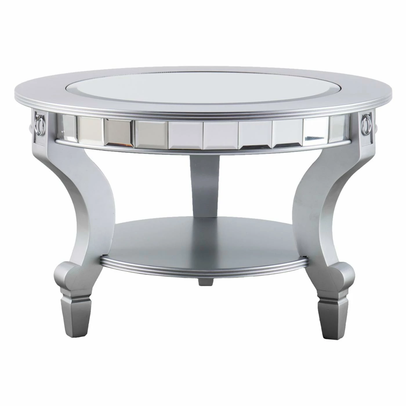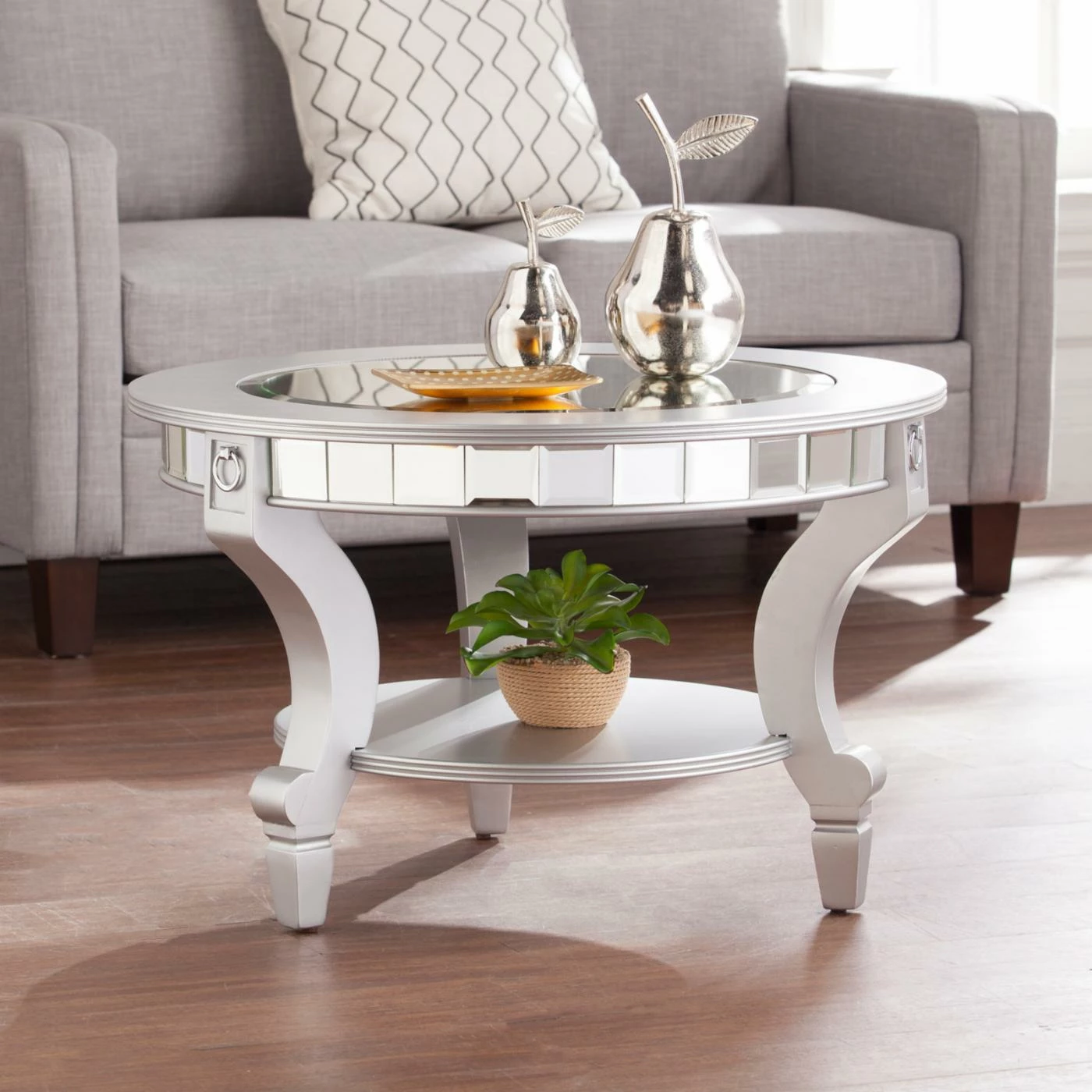 Hand-placed beveled mirrors and a matte silver finish give this Southern Enterprises Lindsay Glam Mirrored Round Cocktail Table – Matte Silver its modern glamour. Thick saber legs, tapered feet, and silver toned rings enhance the design. This round cocktail table includes a lower shelf for double the display space.