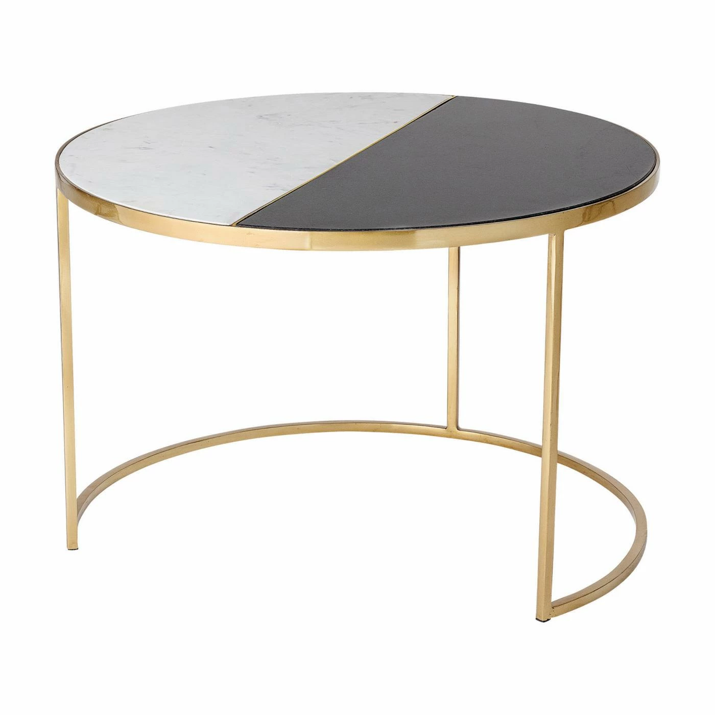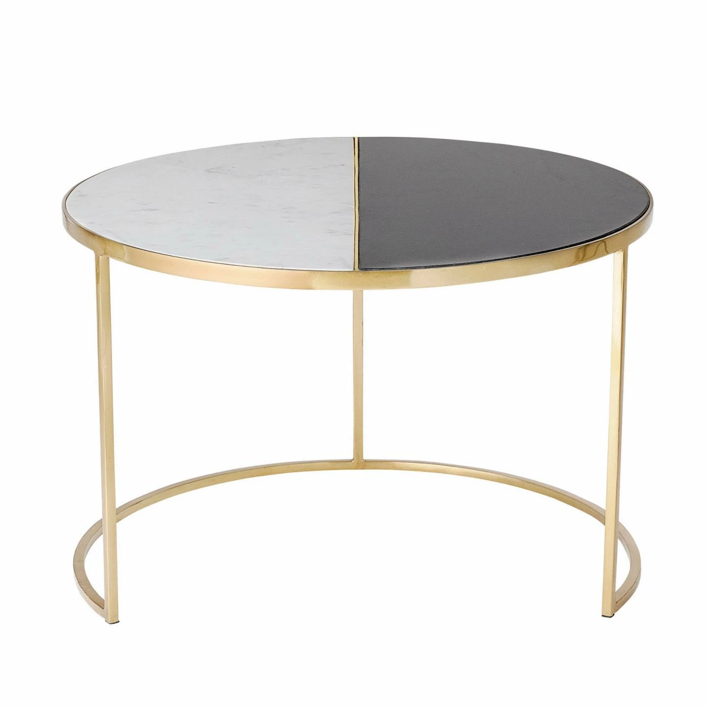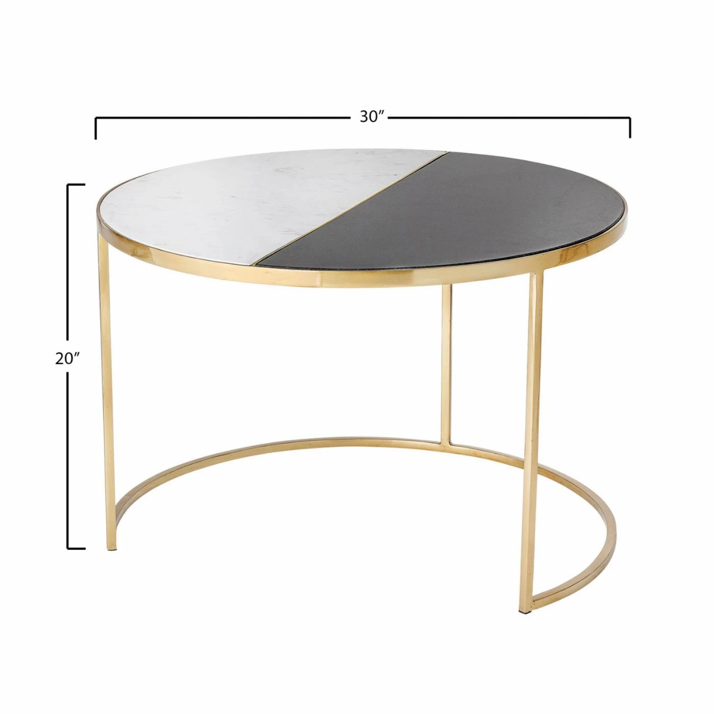 Bring balance to your living space with the Black and White Marble Coffee Table by Sprinkle & Bloom. This coffee table functions as an accent table or an end table in larger rooms, and is comprised of easy-to-style neutrals. The marble tabletop is split down the middle into white and black, and the entire base is made from a rich, polished golden metal. The circular base of the frame is open in one section for a convenient way to store ottomans or baskets, or just for architectural interest. Some assembly required.
