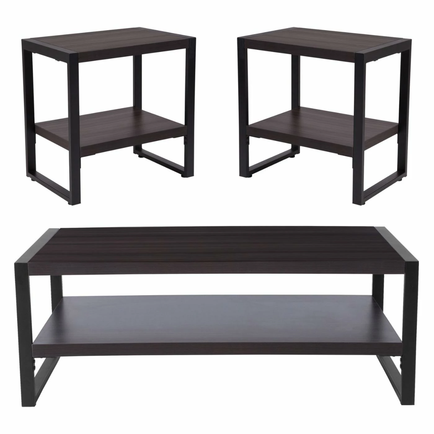 Clean lines and robust features make the Flash Furniture Thompson 3 Piece Coffee Table Set just what your living space demands. The set includes a rectangular coffee table and its two end tables. Each sports a thick laminate top and matching lower shelf for twice the display space. Open rectangular leg bases are formed of wide metal in a black finish.