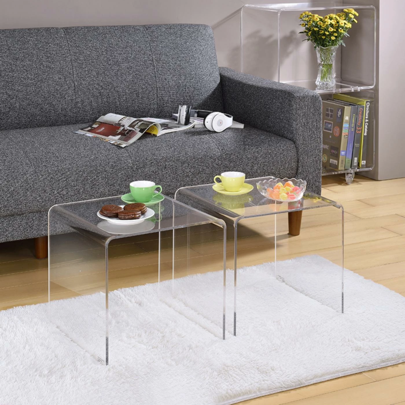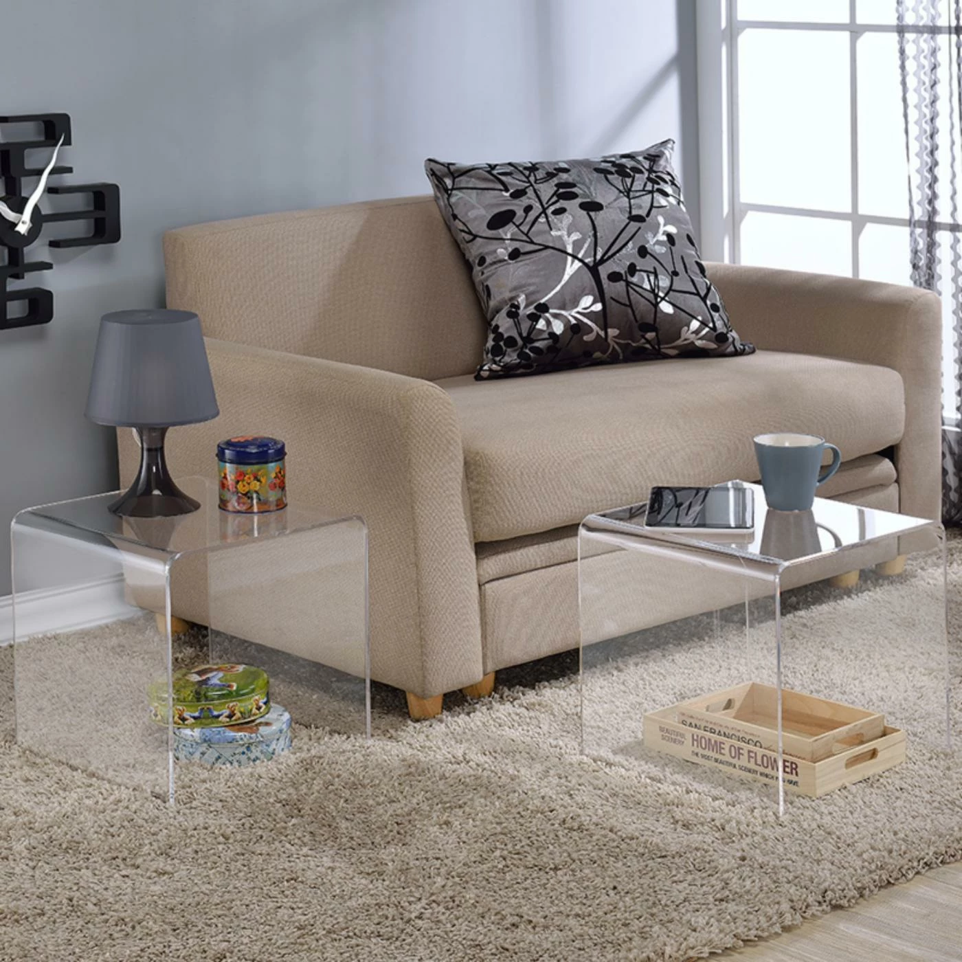 Expand your living room furniture without overwhelming the eye with the Fox Hill Trading Acrylic Cocktail Tables – Set of 2. Two matching square cocktail tables are included in this set. Made from solid, single pieces of clear acrylic, the tables have curved corners that transition the tops into the sturdy waterfall legs. Keep the surface clean with a damp cloth as necessary. Ideal for display pieces, table lamps, drink service, and more.