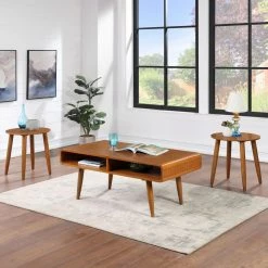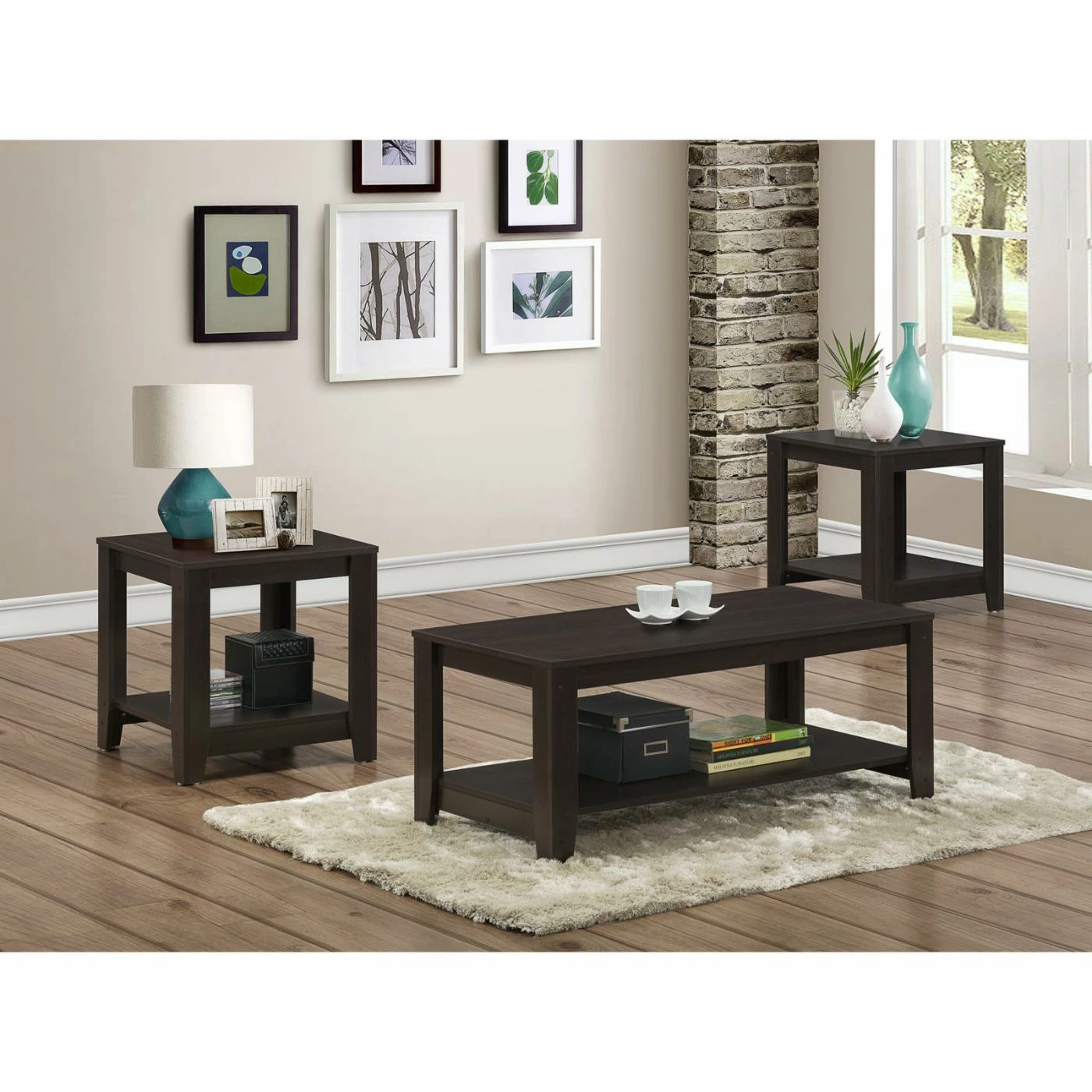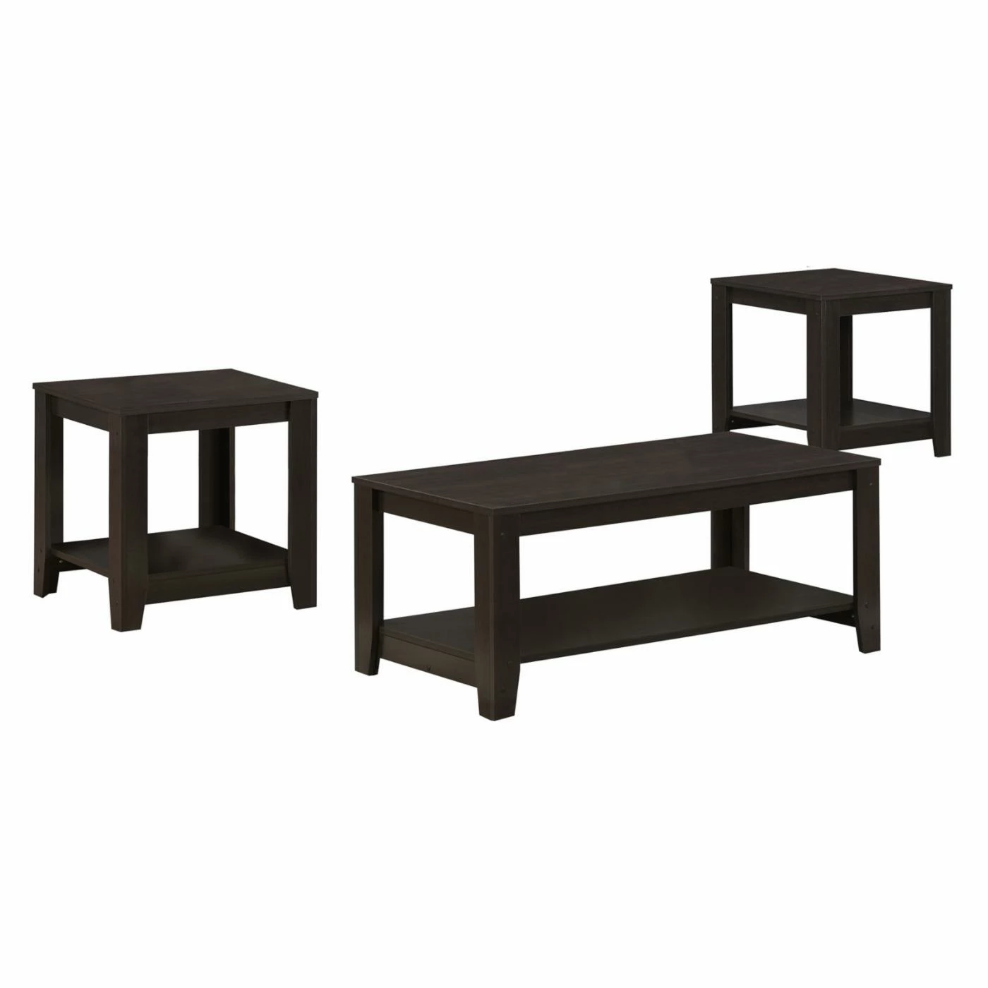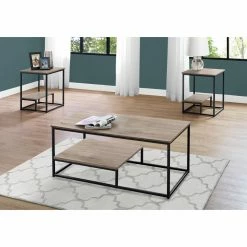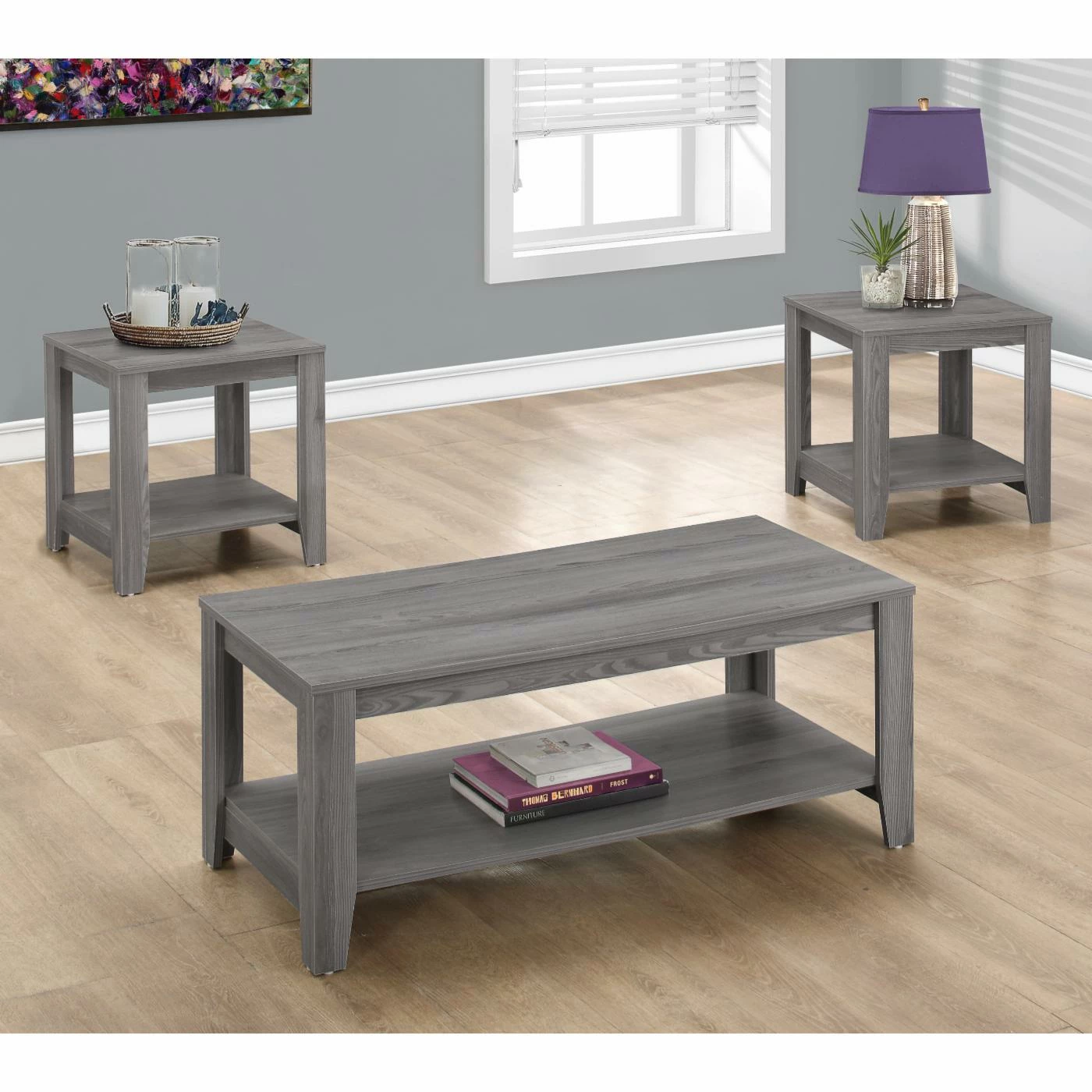 The washed gray Monarch Specialties 3 Piece Rectangle Coffee Table Set includes a rectangular coffee table and two matching square end tables. This trio is wonderful for establishing a casual or contemporary ambiance and with each table cradling a lower storage shelf between its tapered legs, you’ll also enjoy a great deal of space-saving options for organizing and displaying books, movies, extra blankets, and accent pieces. The end tables make the perfect foundation for lamps and potted plants, and the coffee table is a must for serving drinks and appetizers to houseguests. Choose from the available finishes.