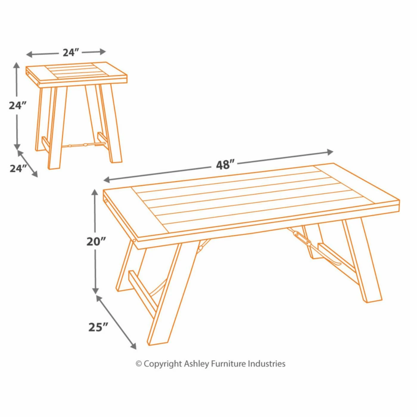 Enjoy the rustic details of the Signature Design by Ashley Noorbrook 3 Piece Coffee Table Set in your coastal, country, or even modern home. This versatile set includes two square end tables and a rectangular coffee table constructed of acacia veneers, wood, and engineered wood. A black wash finish highlights the planked effect of the breadboard layup tabletops. Metal stretchers and canted legs complete the look and add visual texture.