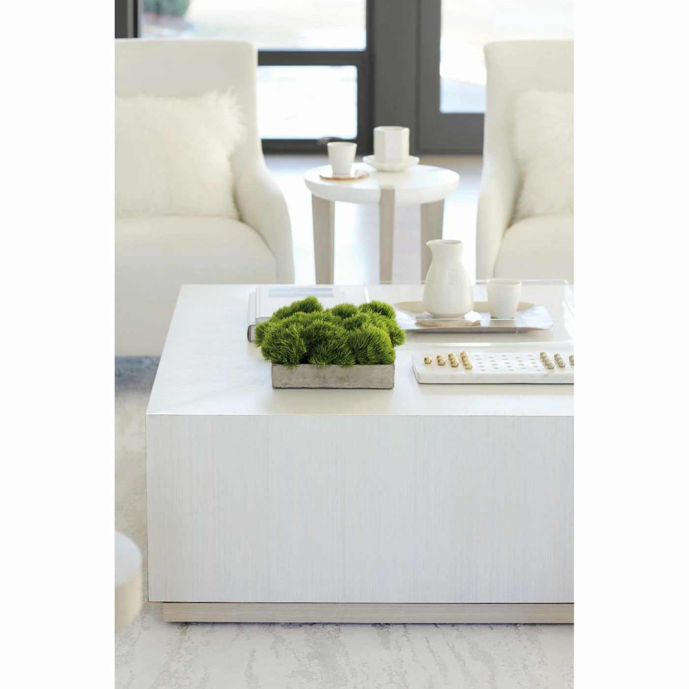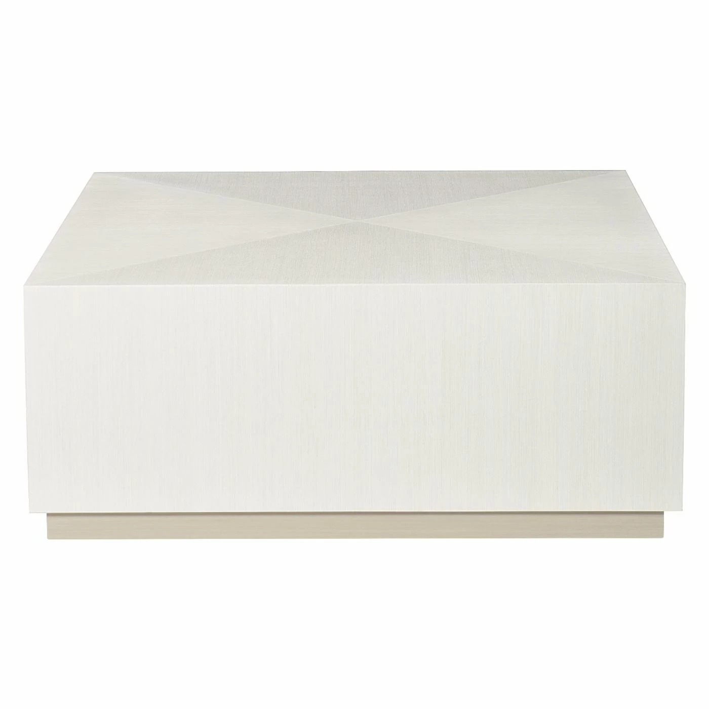 The Bernhardt Axiom Square Cocktail Table is crafted in a thick, square shape resting on a plinth base in a linear gray finish. Made from sturdy poplar solids, this modern cocktail table is sure to become a favorite staple in any room of your home. The fancy face top and sides are accented in a linear white finish that gives the table an inviting look suitable for your favorite gathering or entertaining space.