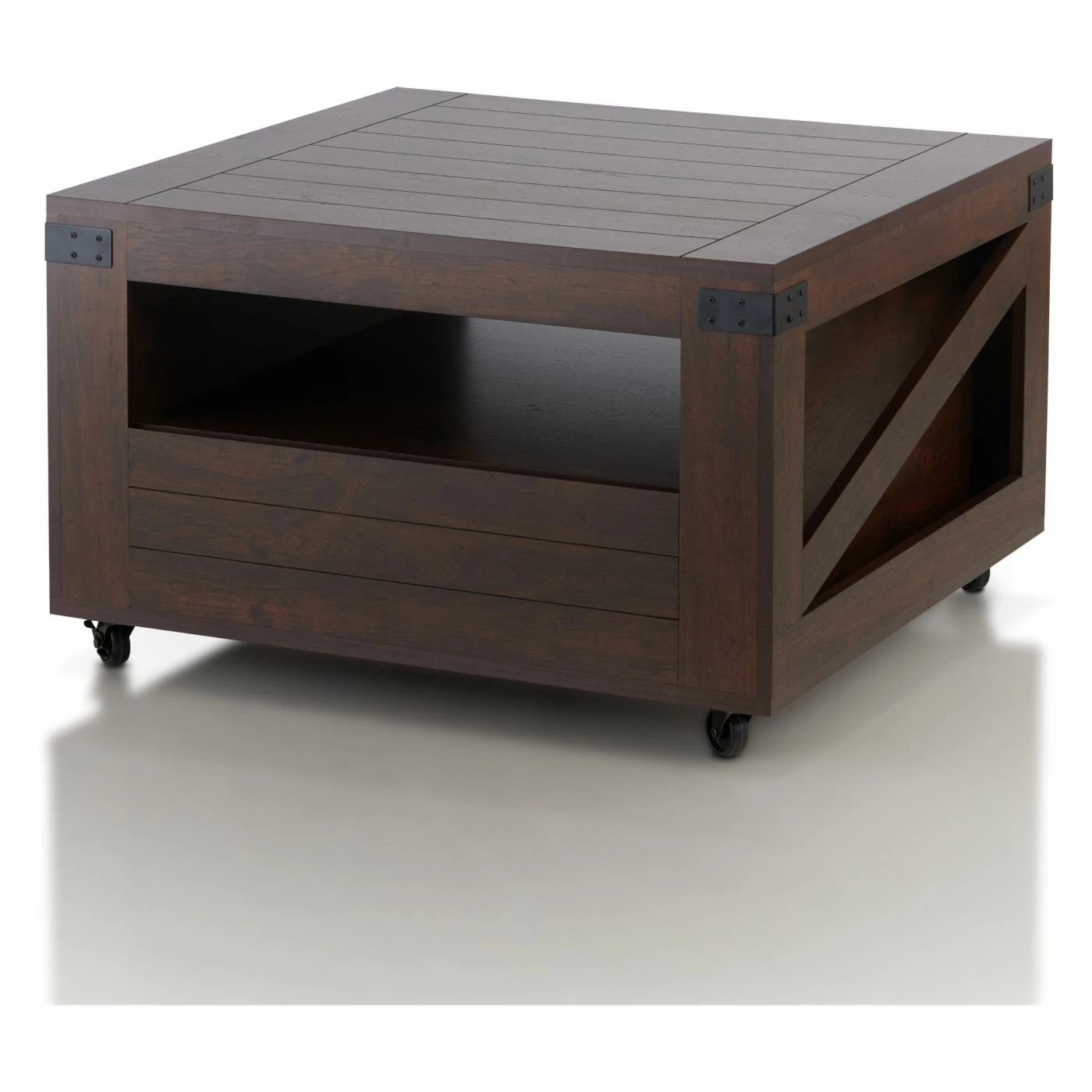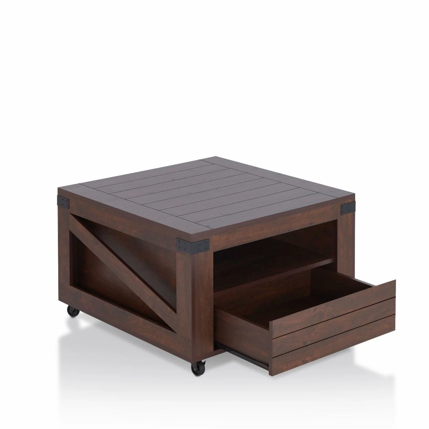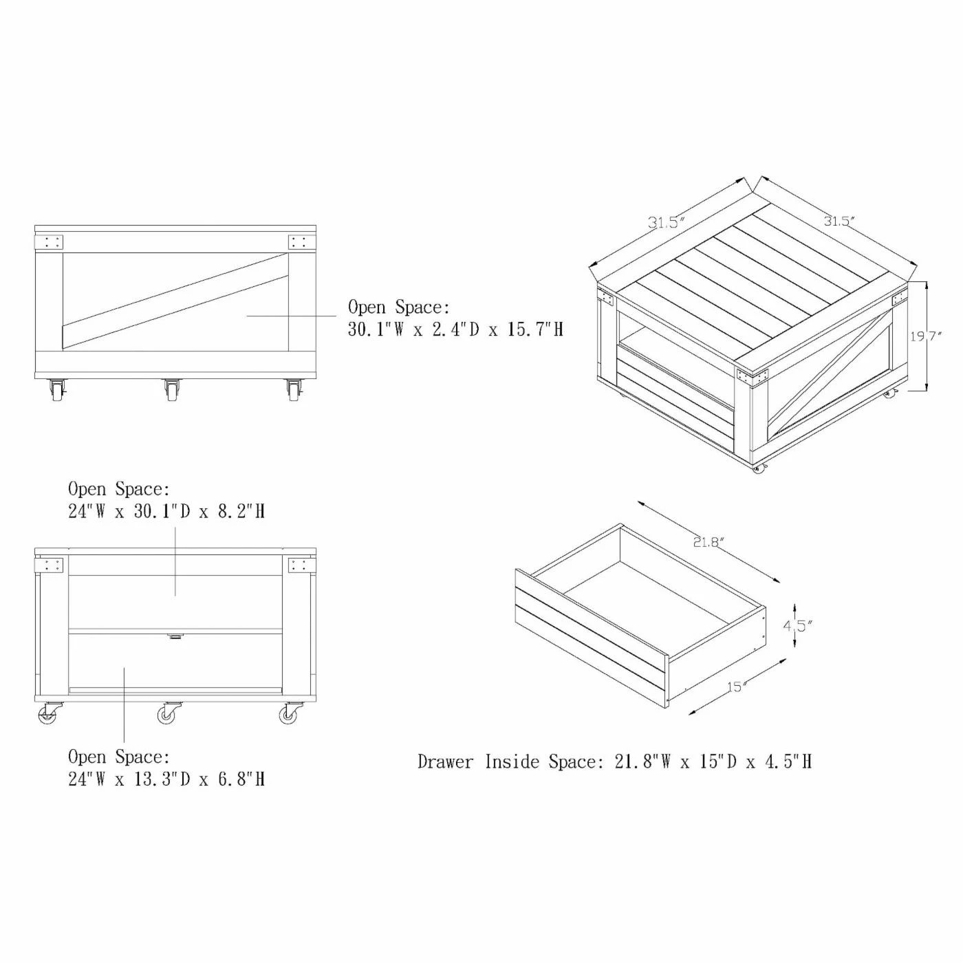 The HN Home Harper Modern Farmhouse Coffee Table is a transitional piece blending a rich wood finish with industrial metallic accents. This sturdy square table sits on five metal casters, making it simple to move this table from room to room. Enjoy the convenience of both open and closed storage, including a hidden bottom drawer, open shelf under the tabletop, and a side compartment perfect for storing newspapers and magazines.