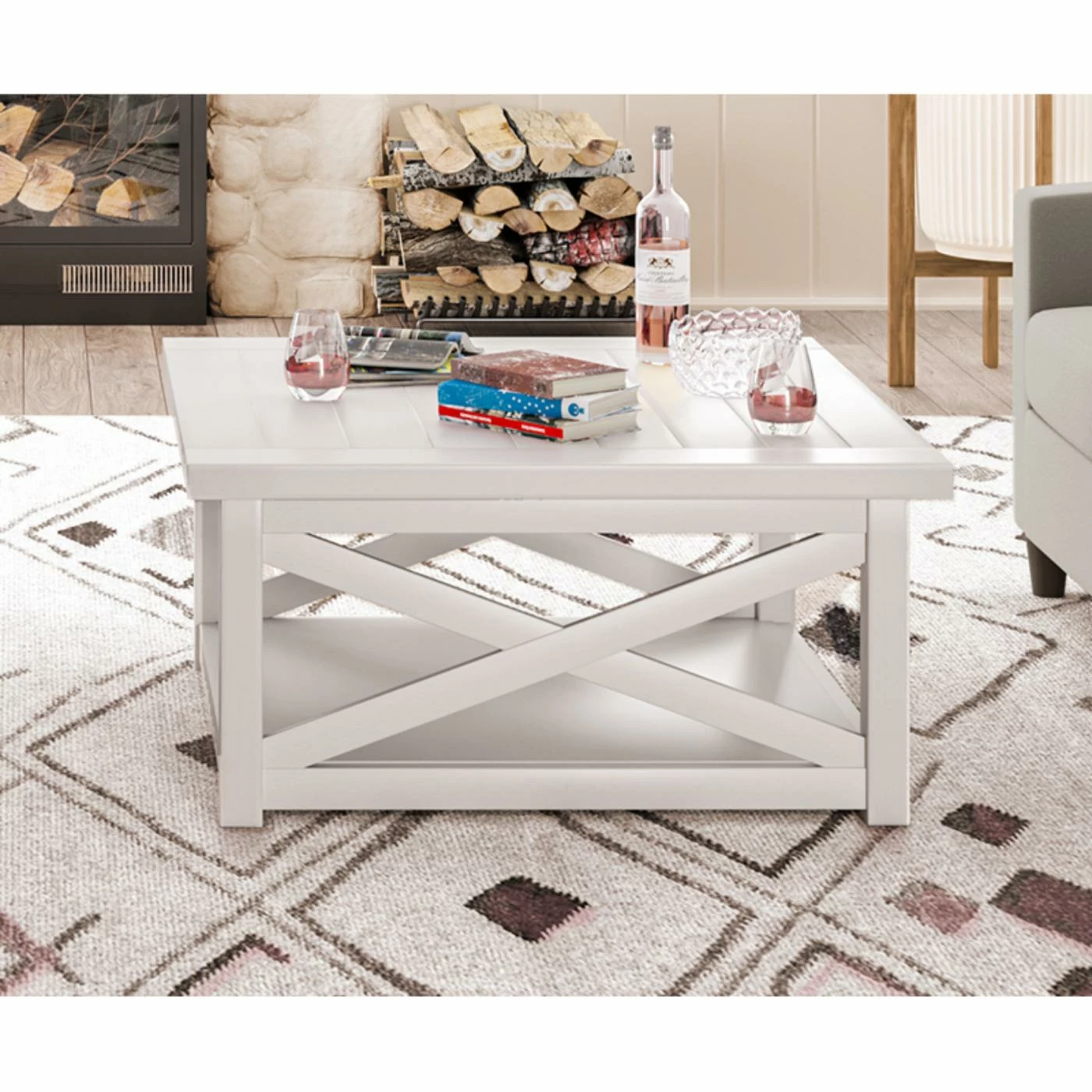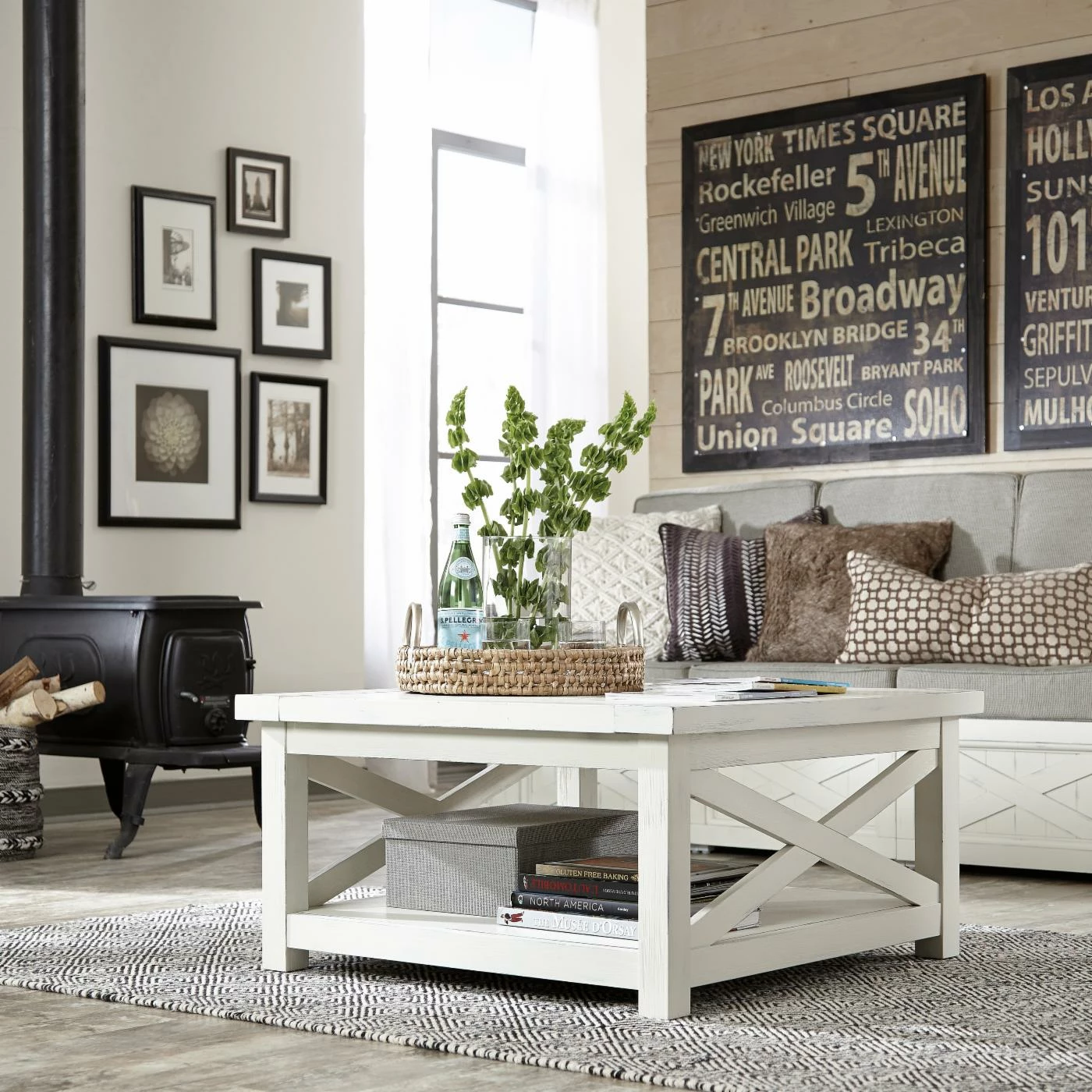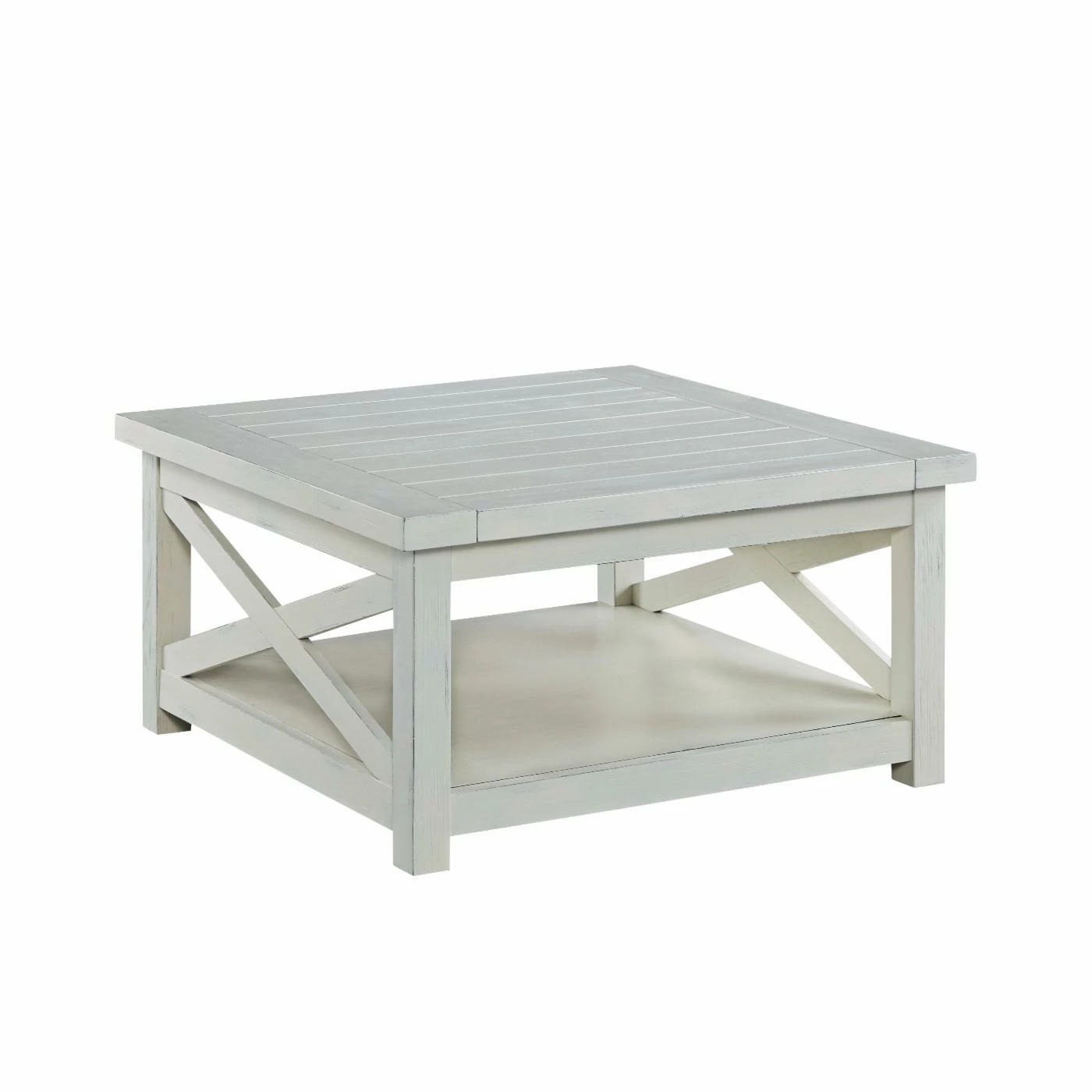 Perfect for a coastal space, the Home Styles Seaside Lodge Coffee Table features inset wainscoting and a weathered white finish. This coffee table is durably constructed from mahogany solids and engineered wood. Wire brushed details give it a distressed look. The lower shelf is accented with X-style sides. Add a couple woven baskets to the shelf for magazines, remote controls, or coasters.
