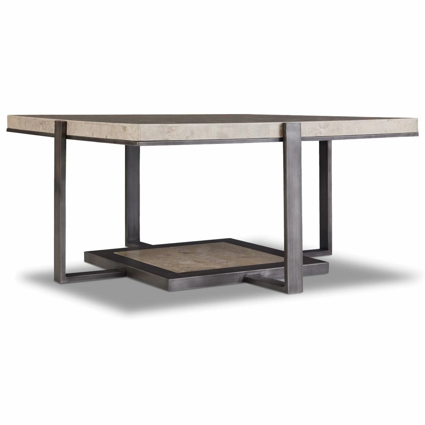 Indulge in the polished smoothness of marble with the Hooker Furniture Square Cocktail Table. The rectangular top is a mosaic of marble blocks in creamy beige. No two tops are alike, as each block contains natural color variations, pitting, and inclusions that create a one-of-a-kind texture. A metal support runs from table top to floor at the center of each side; these supports meet in the middle, forming a square display shelf inset with marble to match. Gray-finished metal beams hint toward industrial-contemporary leanings.