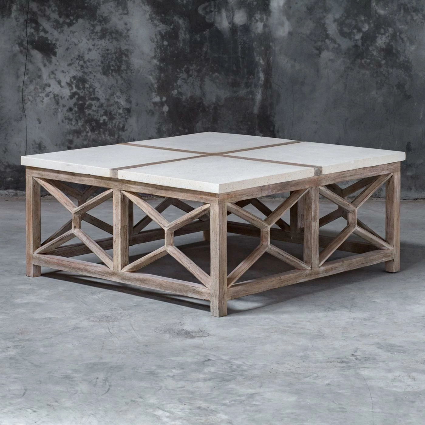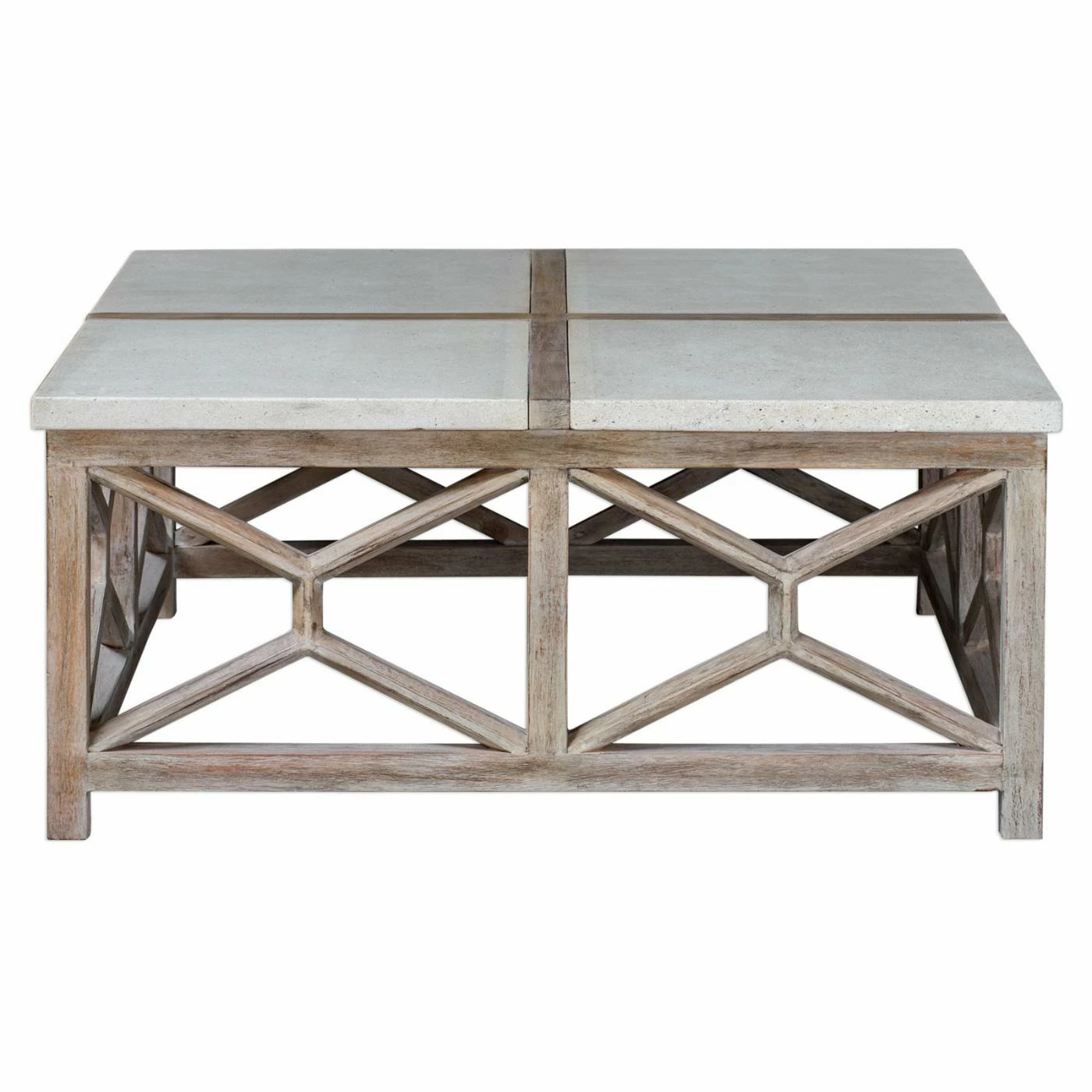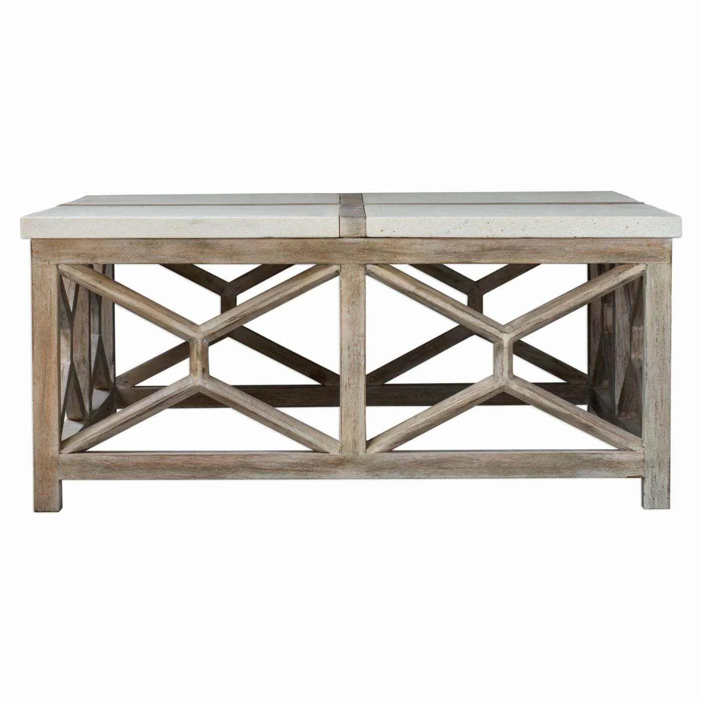 Natural finishing lends the HumbleNest Nashau Farmhouse / Cottage Stone Coffee Table a refined, yet rustic look in your home. The top of this coffee table is crafted from elegant white limestone. The geometric-styled frame is constructed of strong java wood accented by compressed wood. A light oatmeal finish highlights the wood, while adding weathered detail.